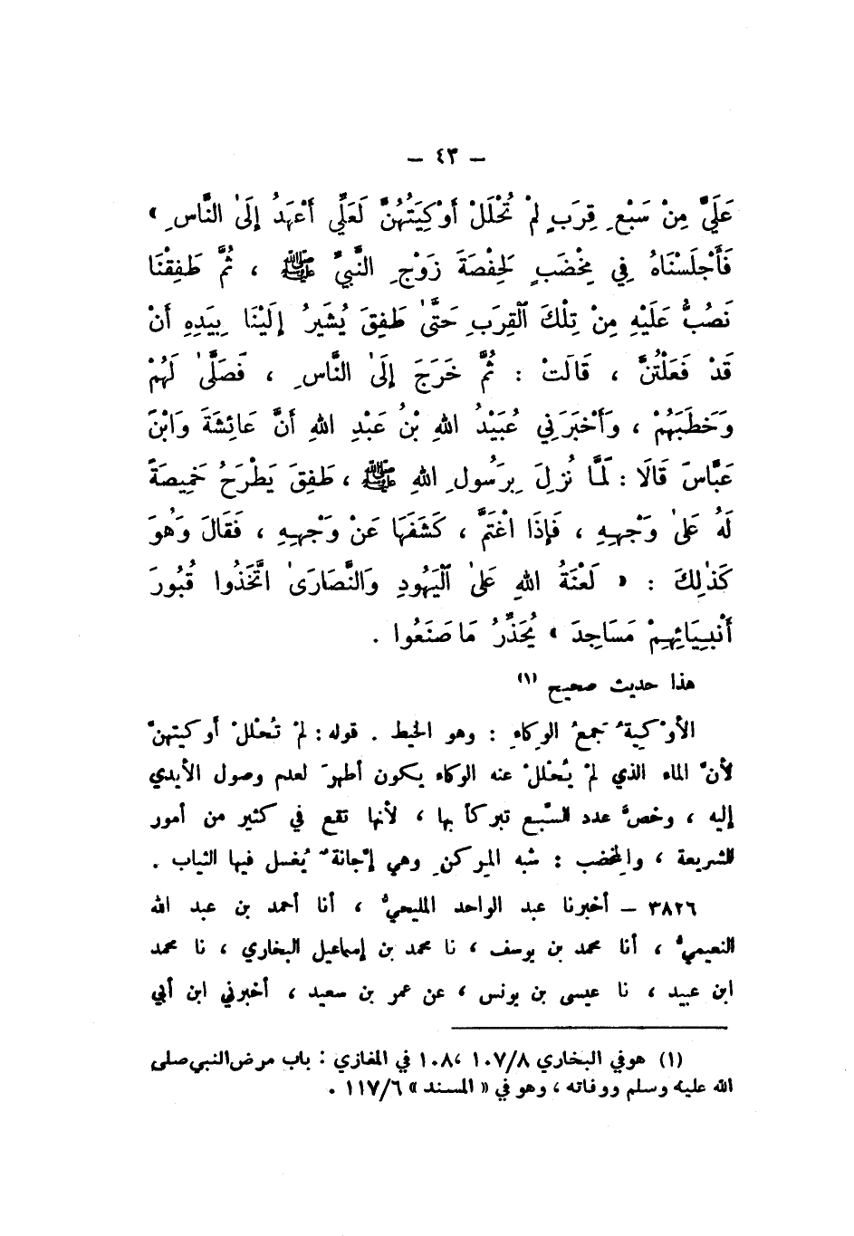 عَلَيَّ مِنْ سَبْعِ قِرَبٍ لَمْ تُحْلَلْ أَوْكِيَتُهُنَّ لَعَلِّي أَعْهَدُ إِلَى النَّاسِ»، فَأَجْلَسْنَاهُ فِي مِخْضَبٍ لِحَفْصَةَ زَوْجِ النَّبِيِّ صَلَّى اللهُ عَلَيْهِ وَسَلَّمَ ثُمَّ طَفِقْنَا نَصُبُّ عَلَيْهِ مِنْ تِلْكَ الْقِرَبِ حَتَّى طَفِقَ يُشِيرُ إِلَيْنَا بِيَدِهِ أَنْ قَدْ فَعَلْتُنَّ، قَالَتْ: ثُمَّ خَرَجَ إِلَى النَّاسِ، فَصَلَّى لَهُمْ وَخَطَبَهُمْ، وَأَخْبَرَنِي عُبَيْدُ اللَّهِ بْنُ عَبْدِ اللَّهِ، أَنَّ عَائِشَةَ، وَابْنَ عَبَّاسٍ، قَالا: لَمَّا نُزِلَ بِرَسُولِ اللَّهِ صَلَّى اللهُ عَلَيْهِ وَسَلَّمَ طَفِقَ يَطْرَحُ خَمِيصَةً لَهُ عَلَى وَجْهِهِ، فَإِذَا اغْتَمَّ، كَشَفَهَا عَنْ وَجْهِهِ، فَقَالَ وَهُوَ كَذَلِكَ: «لَعْنَةُ اللَّهِ عَلَى الْيَهُودِ وَالنَّصَارَى اتَّخَذُوا قُبُورَ أَنْبِيَائِهِمْ مَسَاجِدَ»، يُحَذِّرُ مَا صَنَعُوا.