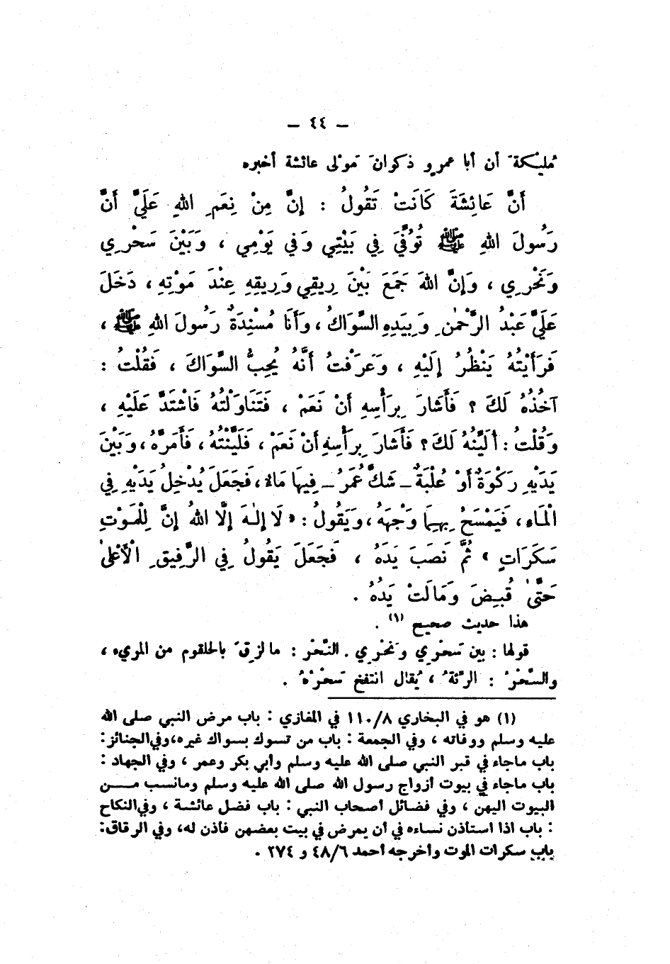 مُلَيْكَةَ، أَنَّ أَبَا عَمْرٍو ذَكْوَانَ مَوْلَى عَائِشَةَ أَخْبَرَهُ، أَنَّ عَائِشَةَ، كَانَتْ تَقُولُ: إِنَّ مِنْ نِعَمِ اللَّهِ عَلَيَّ أَنّ رَسُولَ اللَّهِ صَلَّى اللهُ عَلَيْهِ وَسَلَّمَ تُوُفِّيَ فِي بَيْتِي وَفِي يَوْمِي، وَبَيْنَ سَحْرِي وَنَحْرِي، وَإِنَّ اللَّهَ جَمَعَ بَيْنَ رِيقِي وَرِيقِهِ عِنْدَ مَوْتِهِ، دَخَلَ عَلَيَّ عَبْدُ الرَّحْمَنِ وَبِيَدِهِ السِّوَاكُ، وَأَنَا مُسْنِدَةٌ رَسُولَ اللَّهِ صَلَّى اللهُ عَلَيْهِ وَسَلَّمَ فَرَأَيْتُهُ يَنْظُرُ إِلَيْهِ، وَعَرَفْتُ أَنَّهُ يُحِبُّ السِّوَاكَ، فَقُلْتُ: آخُذُهُ لَكَ؟ فَأَشَارَ بِرَأْسِهِ أَنْ نَعَمْ، فَتَنَاوَلْتُهُ فَاشْتَدَّ عَلَيْهِ، وَقُلْتُ: أُلَيِّنُهُ لَكَ؟ فَأَشَارَ بِرَأْسِهِ أَنْ نَعَمْ، فَلَيَّنْتُهُ، فَأَمَرَّهُ، وَبَيْنَ يَدَيْهِ رَكْوَةٌ أَوْ عُلْبَةٌ، شَكَّ عُمَرُ، فِيهَا مَاءٌ، فَجَعَلَ يُدْخِلُ يَدَيْهِ فِي الْمَاءِ، فَيَمْسَحُ بِهِمَا وَجْهَهُ، وَيَقُولُ: «لَا إِلَهَ إِلا اللَّهُ إِنَّ لِلْمَوْتِ سَكَرَاتٌ»، ثُمَّ نَصَبَ يَدَهُ، فَجَعَلَ يَقُولُ: فِي الرَّفِيقُ الأَعْلَى، حَتَّى قُبِضَ وَمَالَتْ يَدُهُ.