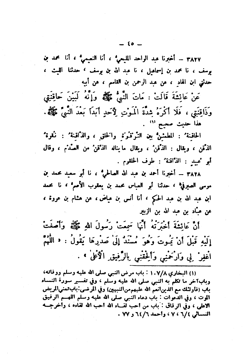 3827 - أَخْبَرَنَا عَبْدُ الْوَاحِدِ الْمَلِيحِيُّ، أَنَا النُّعَيْمِيُّ، أَنَا مُحَمَّدُ بْنُ يُوسُفَ، نَا مُحَمَّدُ بْنُ إِسْمَاعِيلَ، نَا عَبْدُ اللَّهِ بْنُ يُوسُفَ، حَدَّثَنَا اللَّيْثُ، حَدَّثَنِي ابْنُ الْهَادِ، عَنْ عَبْدِ الرَّحْمَنِ بْنِ الْقَاسِمِ، عَنْ أَبِيهِ، عَنْ عَائِشَةَ، قَالَتْ: «مَاتَ النَّبِيُّ صَلَّى اللهُ عَلَيْهِ وَسَلَّمَ وَإِنَّهُ لَبَيْنَ حَاقِنَتِي وَذَاقِنَتِي، فَلا أَكْرَةُ شِدَّةَ الْمَوْتِ لأَحَدٍ أَبَدًا بَعْدَ النَّبِيِّ صَلَّى اللهُ عَلَيْهِ وَسَلَّمَ».