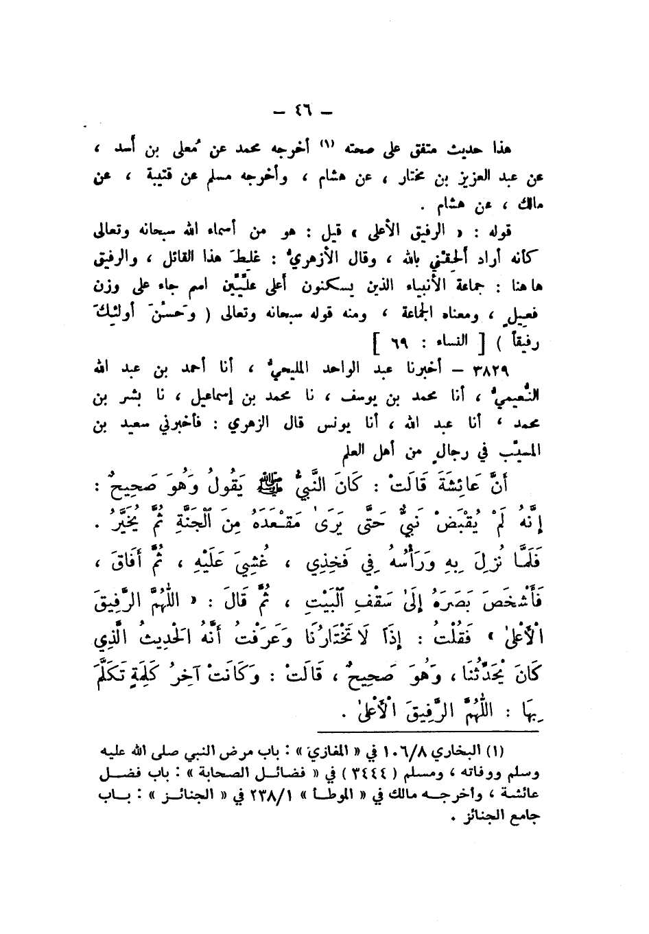 3829 - أَخْبَرَنَا عَبْدُ الْوَاحِدِ الْمَلِيحِيُّ، أَنَا أَحْمَدُ بْنُ عَبْدِ اللَّهِ النُّعَيْمِيُّ، أَنَا مُحَمَّدُ بْنُ يُوسُفَ، نَا مُحَمَّدُ بْنُ إِسْمَاعِيلَ، نَا بِشْرُ بْنُ مُحَمَّدٍ، أَنَا عَبْدُ اللَّهِ، أَنَا يُونُسُ، قَالَ الزُّهْرِيُّ: فَأَخْبَرَنِي سَعِيدُ بْنُ الْمُسَيِّبِ، فِي رِجَالٍ مِنْ أَهْلِ الْعِلْمِ أَنَّ عَائِشَةَ، قَالَتْ: كَانَ النَّبِيُّ صَلَّى اللهُ عَلَيْهِ وَسَلَّمَ يَقُولُ وَهُوَ صَحِيحٌ: «إِنَّهُ لَمْ يُقْبَضْ نَبِيٌّ حَتَّى يَرَى مَقْعَدَهُ مِنَ الْجَنَّةِ، ثُمَّ يُخَيَّرُ»، فَلَمَّا نَزَلَ بِهِ وَرَأْسُهُ فِي فَخِذِي، غُشِيَ عَلَيْهِ، ثُمَّ أَفَاقَ، فَأَشْخَصَ بَصَرهُ إِلَى سَقْفِ الْبَيْتِ، ثُمَّ قَالَ: «اللَّهُمَّ الرَّفِيقُ الأَعْلَى»، فَقُلْتُ: إِذًا لَا تَخْتَارَنَا، وَعَرَفْتُ أَنَّهُ الْحَدِيثُ الَّذِي كَانَ يُحَدِّثُنَا، وَهُوَ صَحِيحٌ.