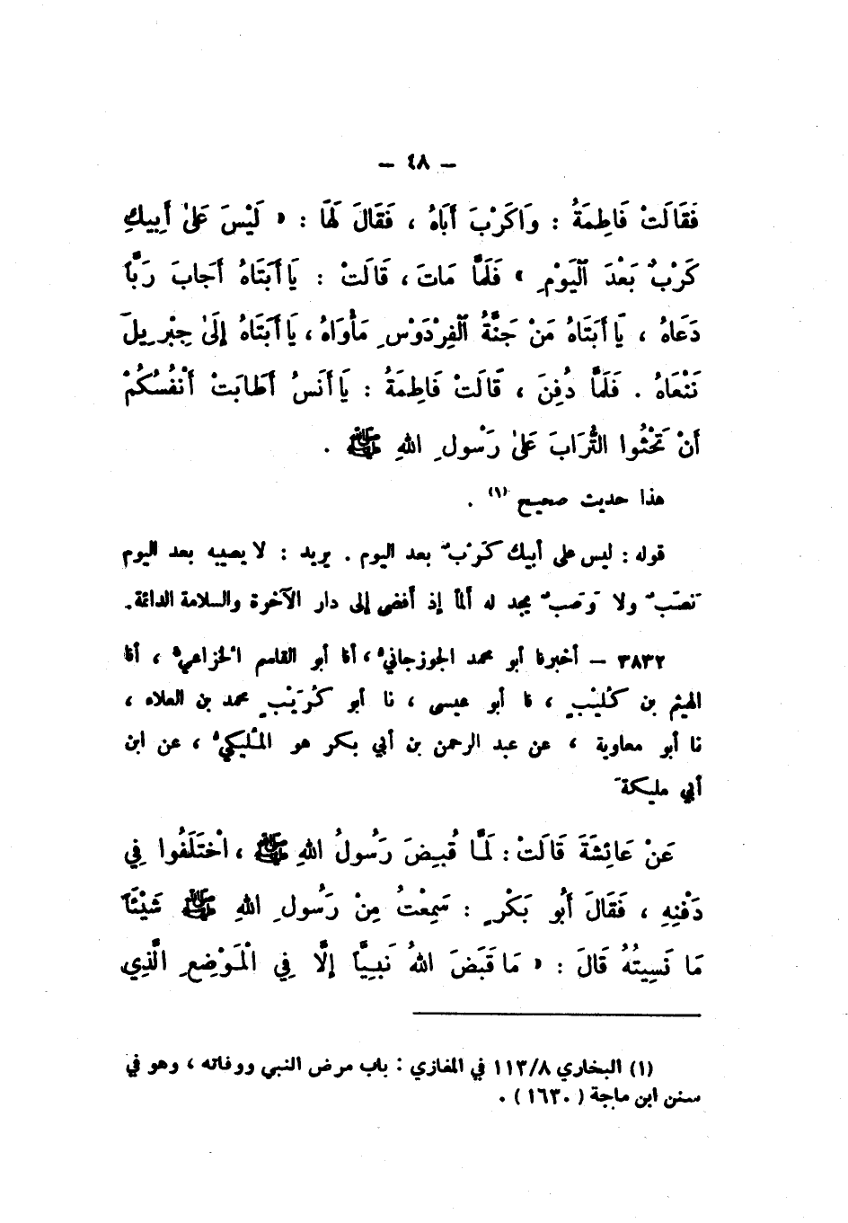 فَقَالَتْ فَاطِمَةُ: وَاكَرْبَ أَبَاهُ، فَقَالَ لَهَا: «لَيْسَ عَلَى أَبِيكِ كَرْبٌ بَعْدَ الْيَوْمِ»، فَلَمَّا مَاتَ، قَالَتْ: يَا أَبَتَاهُ أَجَابَ رَبًّا دَعَاهُ، يَا أَبَتَاهُ مِنْ جَنَّةِ الْفِرْدَوْسِ مَأْوَاهُ، يَا أَبَتَاهُ إِلَى جِبْرِيلَ نَنْعَاهُ، فَلَمَّا دُفِنَ، قَالَتْ فَاطِمَةُ: يَا أَنَسُ، أَطَابَتْ أَنْفُسُكُمْ أَنْ تَحْثُوا التُّرَابَ عَلَى رَسُولِ اللَّهِ صَلَّى اللهُ عَلَيْهِ وَسَلَّمَ.