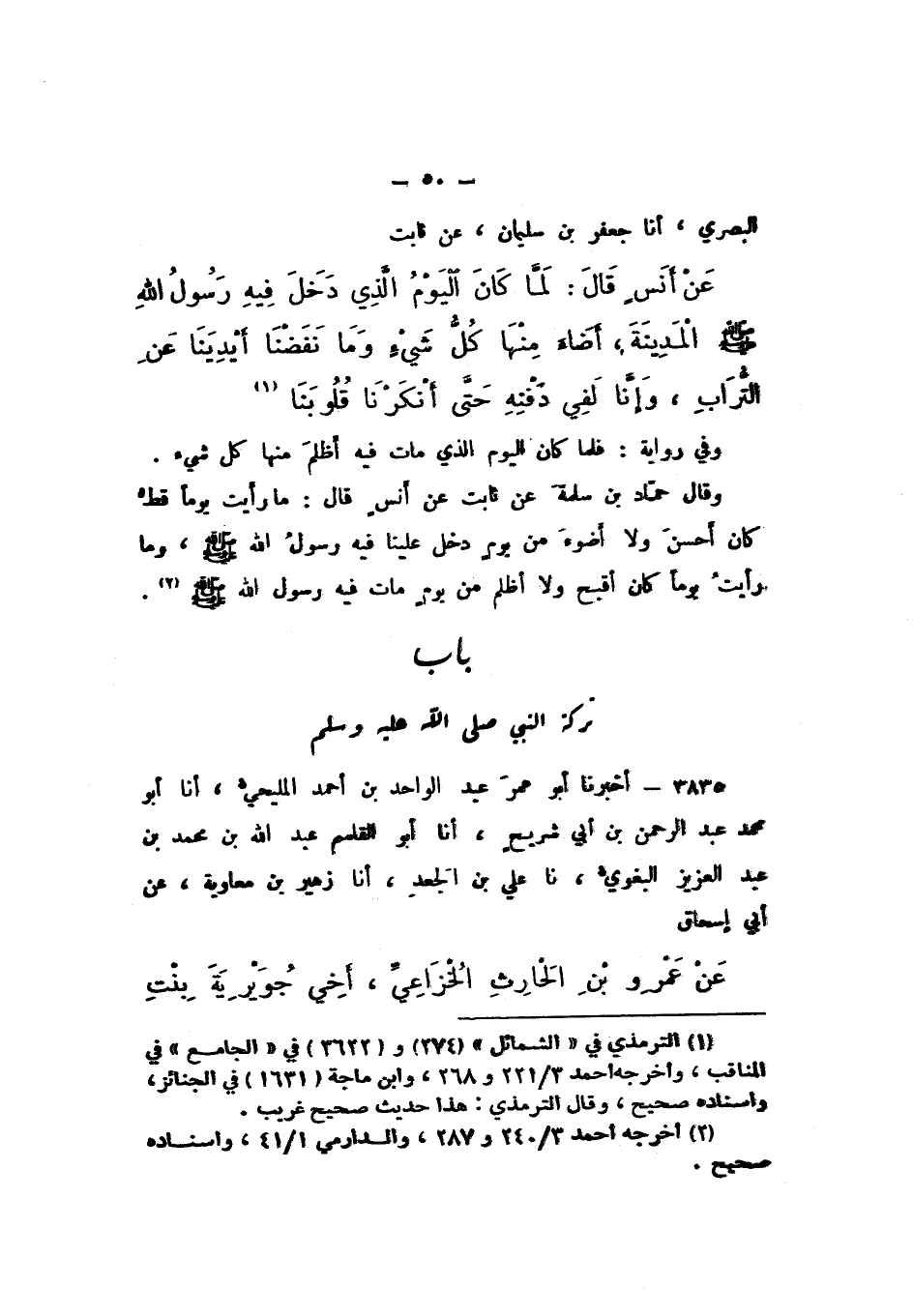 الْبَصْرِيُّ، أَنَا جَعْفَرُ بْنُ سُلَيْمَانَ، عَنْ ثَابِتٍ، عَنْ أَنَسٍ، قَالَ: «لَمَّا كَانَ الْيَوْمُ الَّذِي دَخَلَ فِيهِ رَسُولُ اللَّهِ صَلَّى اللهُ عَلَيْهِ وَسَلَّمَ الْمَدِينَةَ، أَضَاءَ مِنْهَا كُلَّ شَيْءٍ وَمَا نَفَضْنَا أَيْدِيَنَا عَنِ التُّرَابِ، وَإِنَّا لَفِي دَفْنِهِ حَتَّى أَنْكَرْنَا قُلُوبَنَا».