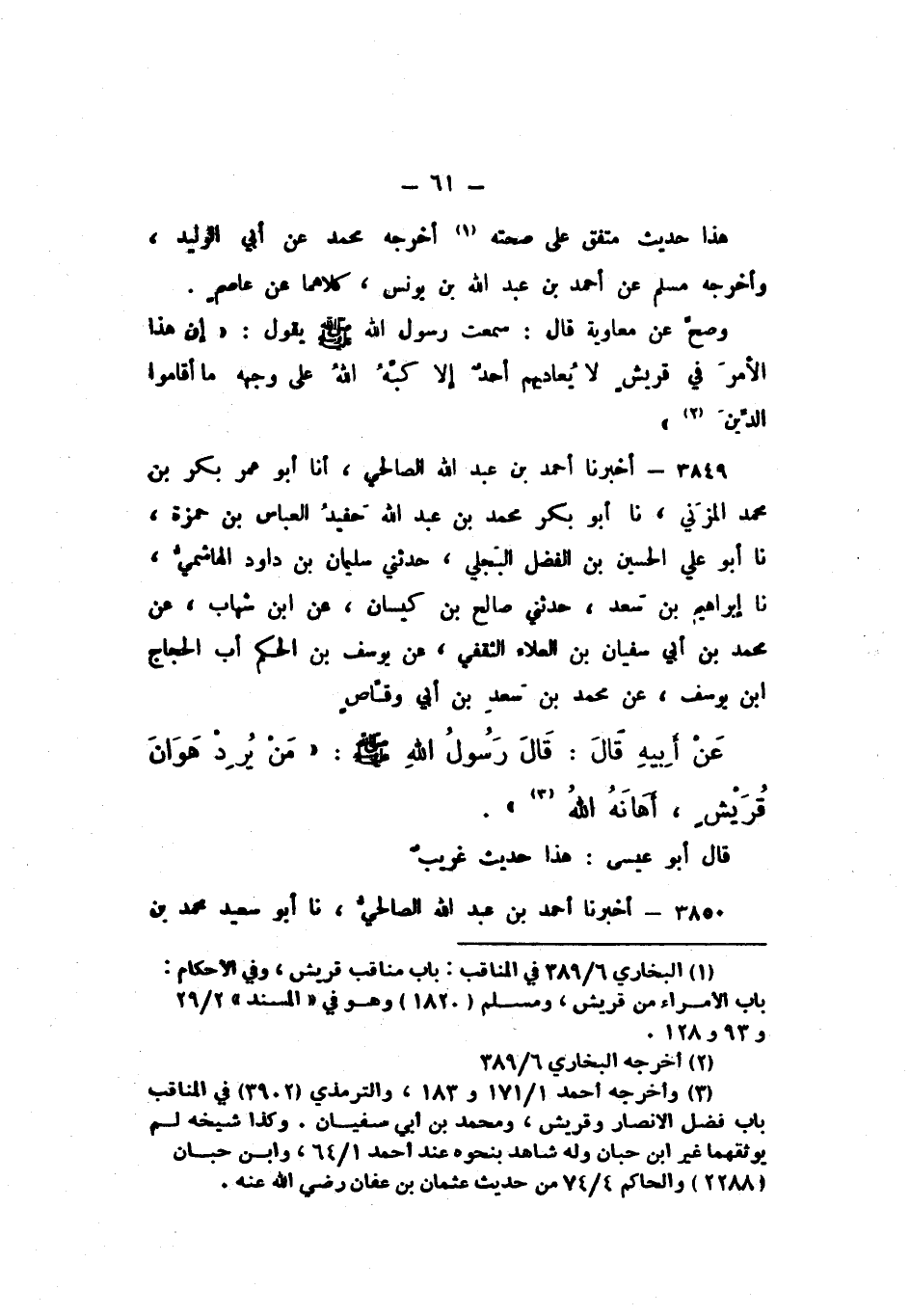 3849 - أَخْبَرَنَا أَحْمَدُ بْنُ عَبْدِ اللَّهِ الصَّالِحِيُّ، أَنَا أَبُو عُمَرَ بَكْرُ بْنُ مُحَمَّدٍ الْمُزَنِيُّ، نَا أَبُو بَكْرٍ مُحَمَّدُ بْنُ عَبْدِ اللَّهِ حَفِيدُ الْعَبَّاسِ بْنِ حَمْزَةَ، نَا أَبُو عَلِيٍّ الْحُسَيْنُ بْنُ الْفَضْلِ الْبَجَلِيُّ، حَدَّثَنِي سُلَيْمَانُ بْنُ دَاوُدَ الْهَاشِمِيُّ، نَا إِبْرَاهِيمُ بْنُ سَعْدٍ، حَدَّثَنِي صَالِحُ بْنُ كَيْسَانَ، عَنِ ابْنِ شِهَابٍ، عَنْ مُحَمَّدِ بْنِ أَبِي سُفْيَانَ بْنِ الْعَلاءِ الثَّقَفِيِّ، عَنْ يُوسُفَ بْنِ الْحَكَمِ أَبِي الْحَجَّاجِ بْنِ يُوسُفَ، عَنْ مُحَمَّدِ بْنِ سَعْدِ بْنِ أَبِي وَقَّاصٍ، عَنْ أَبِيهِ، قَالَ: قَالَ رَسُولُ اللَّهِ صَلَّى اللهُ عَلَيْهِ وَسَلَّمَ: «مَنْ يُرِدْ هَوَانَ قُرَيْشٍ، أَهَانَهُ اللَّهُ».