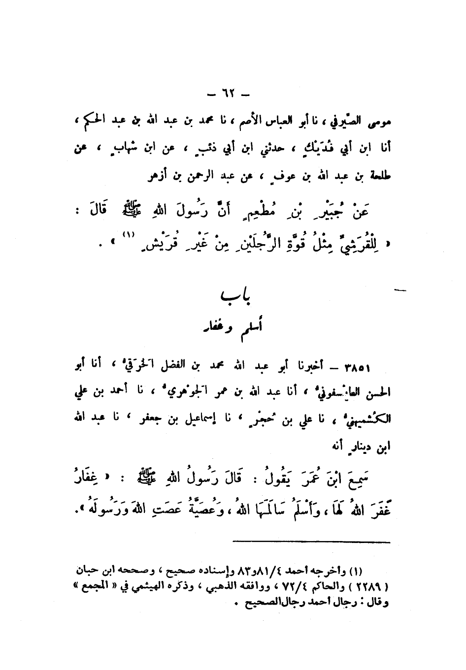 3851 - أَخْبَرَنَا أَبُو عَبْدِ اللَّهِ مُحَمَّدُ بْنُ الْفَضْلِ الْخِرَقِيُّ , أَنَا أَبُو الْحَسَنِ الطَّيْسَفُونِيُّ، أَنَا عَبْدُ اللَّهِ بْنُ عُمَرَ الْجَوْهَرِيُّ، نَا أَحْمَدُ بْنُ عَلِيٍّ الْكُشْمِيهَنِيُّ، نَا عَلِيُّ بْنُ حُجْرٍ، نَا إِسْمَاعِيلُ بْنُ جَعْفَرٍ، نَا عَبْدُ اللَّهِ بْنُ دِينَارٍ، أَنَّهُ سَمِعَ ابْنَ عُمَرَ، يَقُولُ: قَالَ رَسُولُ اللَّهِ صَلَّى اللهُ عَلَيْهِ وَسَلَّمَ: «غِفَارٌ غَفَرَ اللَّهُ لَهَا، وَأَسْلَمُ سَالَمَهَا اللَّهُ، وَعُصَيَّةُ عَصَتِ اللَّهَ وَرَسُولَهُ».