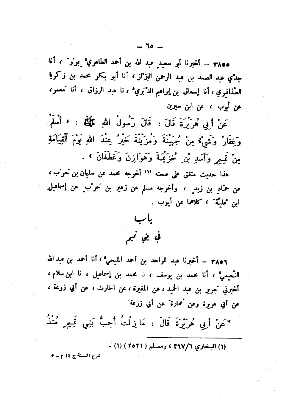 3856 - أَخْبَرَنَا عَبْدُ الْوَاحِدِ الْمَلِيحِيُّ، أَنَا أَحْمَدُ بْنُ عَبْدِ اللَّهِ النُّعَيْمِيُّ، أَنَا مُحَمَّدُ بْنُ يُوسُفَ، نَا مُحَمَّدُ بْنُ إِسْمَاعِيلَ، نَا ابْنُ سَلامٍ، أَخْبَرَنِي جَرِيرُ بْنُ عَبْدِ الْحَمِيدِ، عَنِ الْمُغِيرَةِ، عَنِ الْحَارِثِ، عَنْ أَبِي زُرْعَةَ، عَنْ أَبِي هُرَيْرَةَ، وَعَنْ عُمَارَةَ , عَنْ أَبِي زُرْعَةَ، عَنْ أَبِي هُرَيْرَةَ، قَالَ: مَا زِلْتُ أُحِبُّ بَنِي تَمِيمٍ مُنْذُ