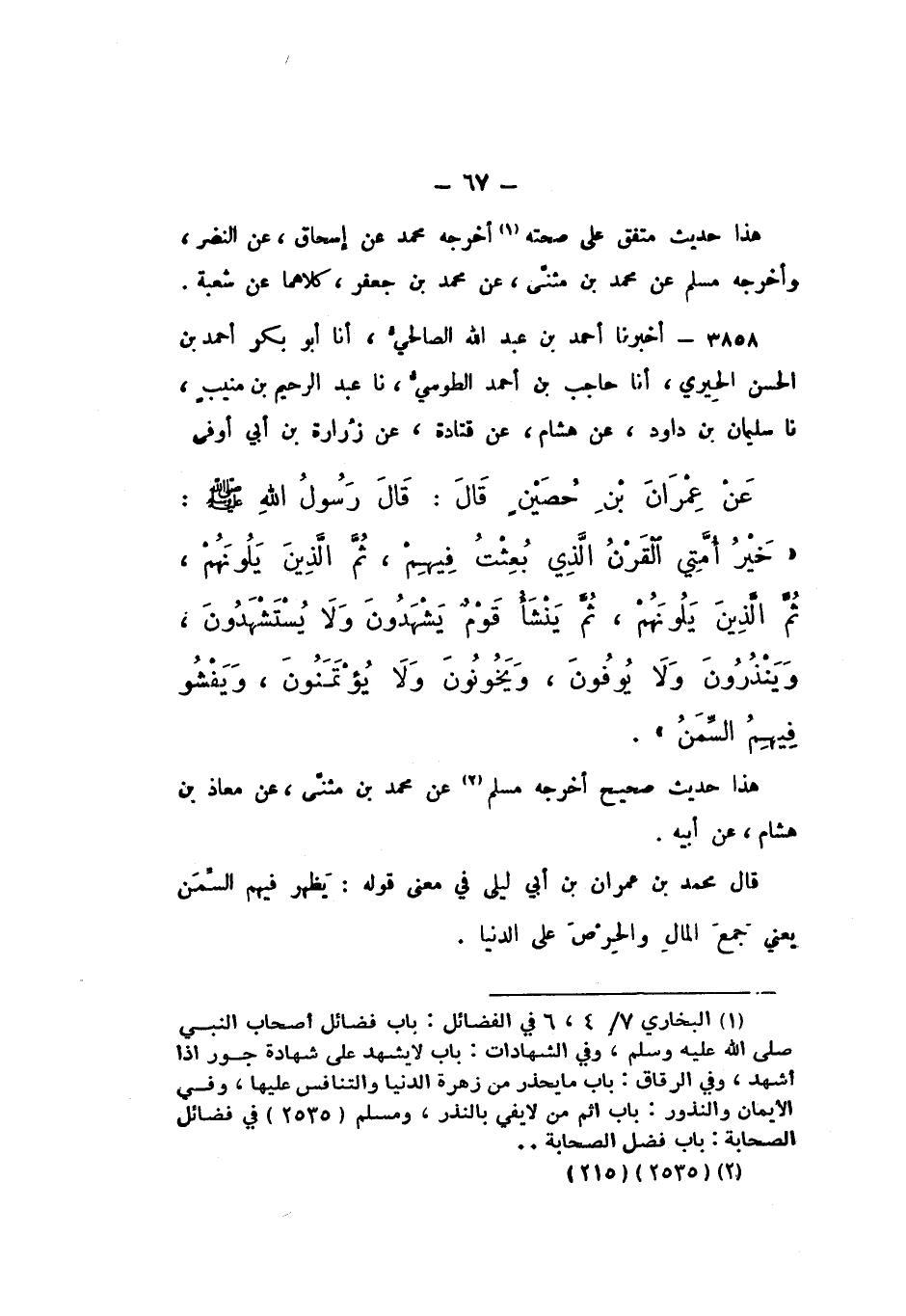3858 - أَخْبَرَنَا أَحْمَدُ بْنُ عَبْدِ اللَّهِ الصَّالِحِيُّ، أَنَا أَبُو بَكْرٍ أَحْمَدُ بْنُ الْحَسَنِ الْحِيرِيُّ، أَنَا حَاجِبُ بْنُ أَحْمَدَ الطُّوسِيُّ، نَا عَبْدُ الرَّحِيمِ بْنُ مُنِيبٍ، نَا سُلَيْمَانُ بْنُ دَاوُدَ، عَنْ هِشَامٍ، عَنْ قَتَادَةَ، عَنْ زُرَارَةَ بْنِ أَبِي أَوْفَى، عَنْ عِمْرَانَ بْنِ حُصَيْنٍ، قَالَ: قَالَ رَسُولُ اللَّهِ صَلَّى اللهُ عَلَيْهِ وَسَلَّمَ: «خَيْرُ أُمَّتِي الْقَرْنُ الَّذِي بُعِثْتُ فِيهِمْ، ثُمَّ الَّذِينَ يَلُونَهُمْ، ثُمَّ الَّذِينَ يَلُونَهُمْ، ثُمَّ يَنْشَأُ قَوْمٌ يَشْهَدُونَ وَلا يُسْتَشْهَدُونَ، وَيَنْذِرُونَ وَلا يُوفُونَ، وَيَخُونُونَ وَلا يُؤْتَمَنُونَ، وَيَفْشُو فِيهِم السِّمَنُ».