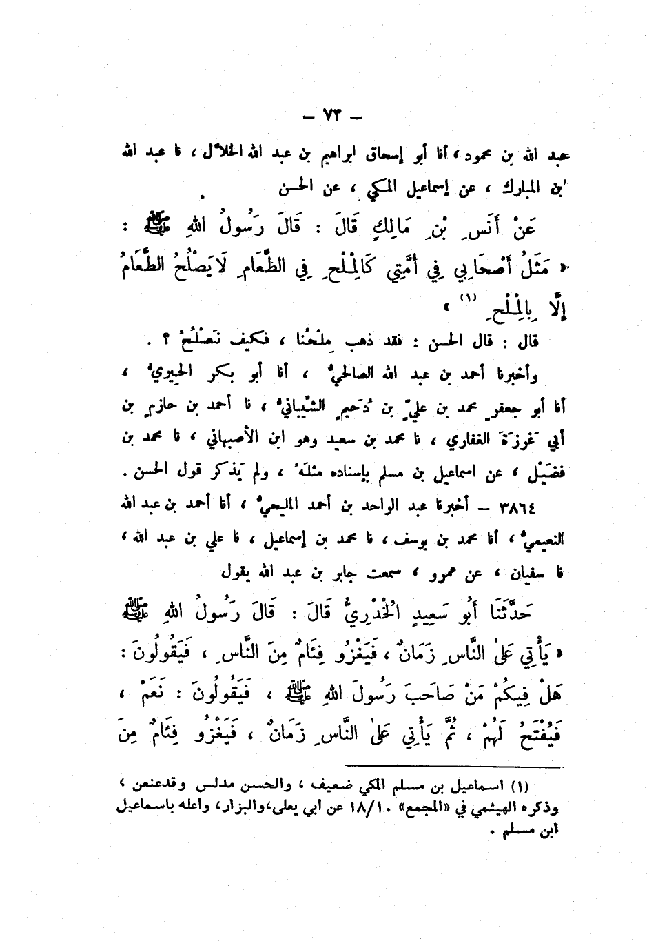 عَبْدُ اللَّهِ بْنُ مَحْمُودٍ، أَنَا أَبُو إِسْحَاقَ إِبْرَاهِيمُ بْنُ عَبْدِ اللَّهِ الْخَلالُ، نَا عَبْدُ اللَّهِ بْنُ الْمُبَارَكِ، عَنْ إِسْمَاعِيلَ الْمَكِّيِّ، عَنِ الْحَسَنِ، عَنْ أَنَسِ بْنِ مَالِكٍ، قَالَ: قَالَ رَسُولُ اللَّهِ صَلَّى اللهُ عَلَيْهِ وَسَلَّمَ: «مَثَلُ أَصْحَابِي فِي أُمَّتِي كَالْمِلْحِ فِي الطَّعَامِ لَا يَصْلُحُ الطَّعَامُ إِلا بِالْمِلْحِ».