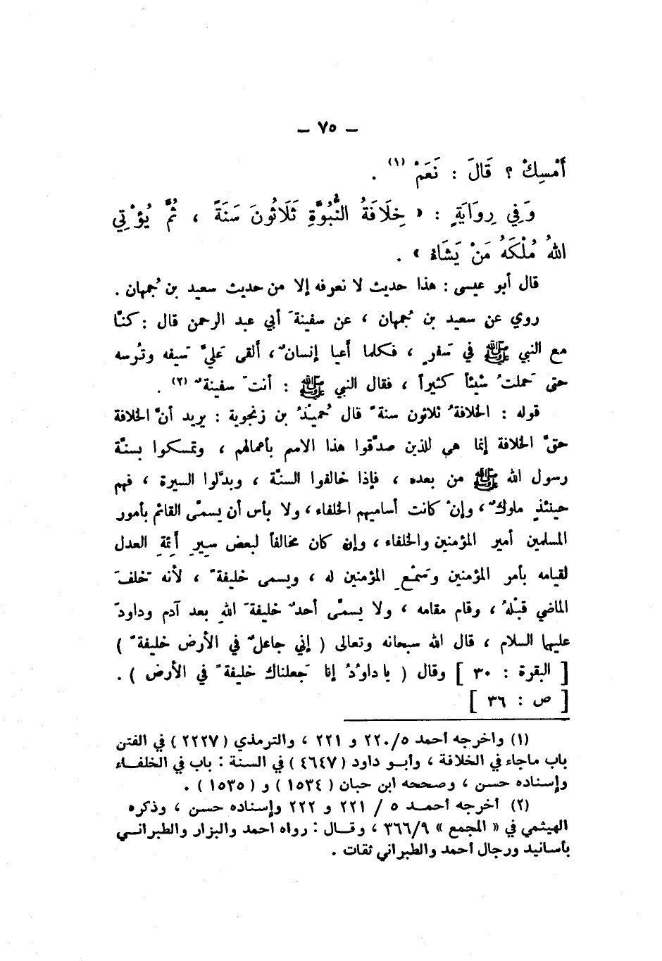 وَفِي رِوَايَةٍ: «خِلافَةُ النُّبُوَّةِ ثَلاثُونَ سَنَةً، ثُمَّ يُؤْتِي اللَّهُ مُلْكَهُ مَنْ يَشَاءُ».