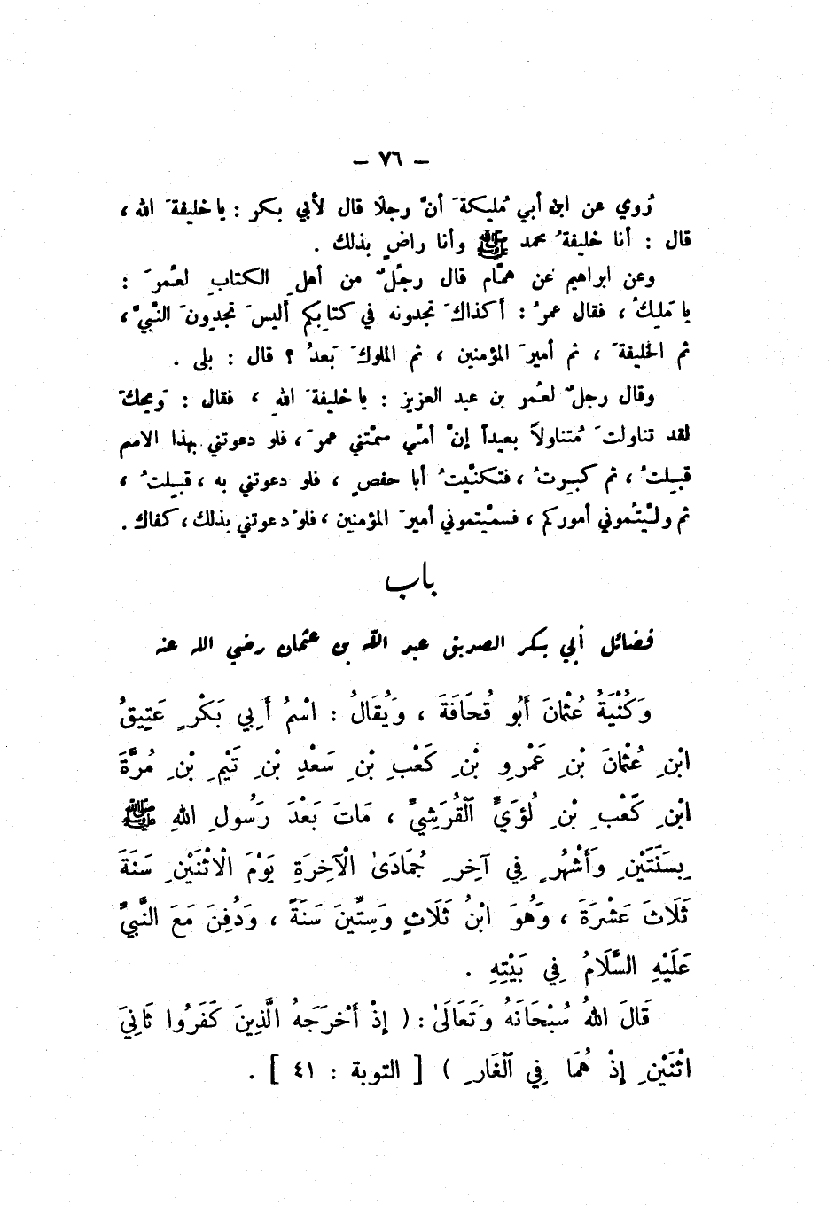 وَكُنْيَةُ عُثْمَانَ أَبُو قُحَافَةَ، وَيُقَالُ: اسْمُ أَبِي بَكْرٍ عَتِيقُ بْنُ عُثْمَانَ بْنِ عَمْرِو بْنِ كَعْبِ بْنِ سَعْدِ بْنِ تَيْمِ بْنِ مُرَّةَ بْنِ كَعْبِ بْنِ لُؤَيٍّ الْقُرَشِيُّ، مَاتَ بَعْدَ رَسُولِ اللَّهِ صَلَّى اللهُ عَلَيْهِ وَسَلَّمَ بِسَنَتَيْنِ وَأَشْهُرٍ، فِي آخِرِ جُمَادَى الآخِرَةِ، يَوْمَ الاثْنَيْنِ، سَنَةَ ثَلاثَ عَشْرَةَ، وَهُوَ ابْنُ ثَلاثٍ وَسِتِّينَ سَنَةً، وَدُفِنَ مَعَ النَّبِيِّ عَلَيْهِ السَّلامُ فِي بَيْتِهِ.