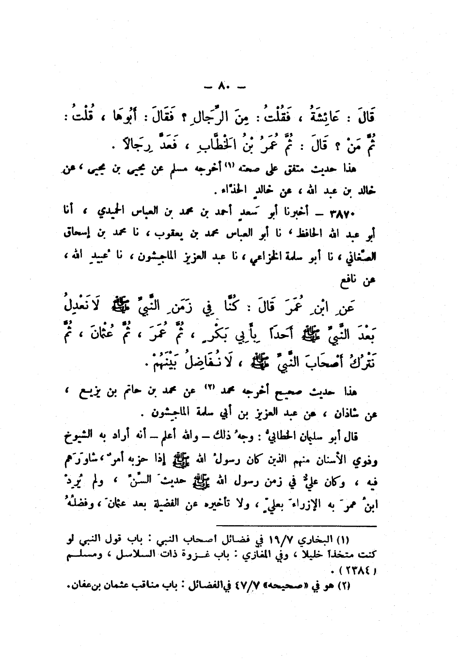 3870 - أَخْبَرَنَا أَبُو سَعْدٍ أَحْمَدُ بْنُ مُحَمَّدِ بْنِ الْعَبَّاسِ الْحُمَيْدِيُّ، أَنَا أَبُو عَبْدِ اللَّهِ الْحَافِظُ، نَا أَبُو الْعَبَّاسِ مُحَمَّدُ بْنُ يَعْقُوبَ، نَا مُحَمَّدُ بْنُ إِسْحَاقَ الصَّغَانِيُّ، نَا أَبُو سَلَمَةَ الْخُزَاعِيُّ، نَا عَبْدُ الْعَزِيزِ الْمَاجِشُونُ، نَا عُبَيْدُ اللَّهِ، عَنْ نَافِعٍ، عَنِ ابْنِ عُمَرَ، قَالَ: «كُنَّا فِي زَمَنِ النَّبِيِّ صَلَّى اللهُ عَلَيْهِ وَسَلَّمَ لَا نَعْدِلُ بَعْدَ النَّبِيِّ صَلَّى اللهُ عَلَيْهِ وَسَلَّمَ أَحَدًا بِأَبِي بَكْرٍ، ثُمَّ عُمَرَ، ثُمَّ عُثْمَانَ، ثُمَّ نَتْرُكُ أَصْحَابَ النَّبِيِّ صَلَّى اللهُ عَلَيْهِ وَسَلَّمَ لَا نُفَاضِلُ بَيْنَهُمْ».