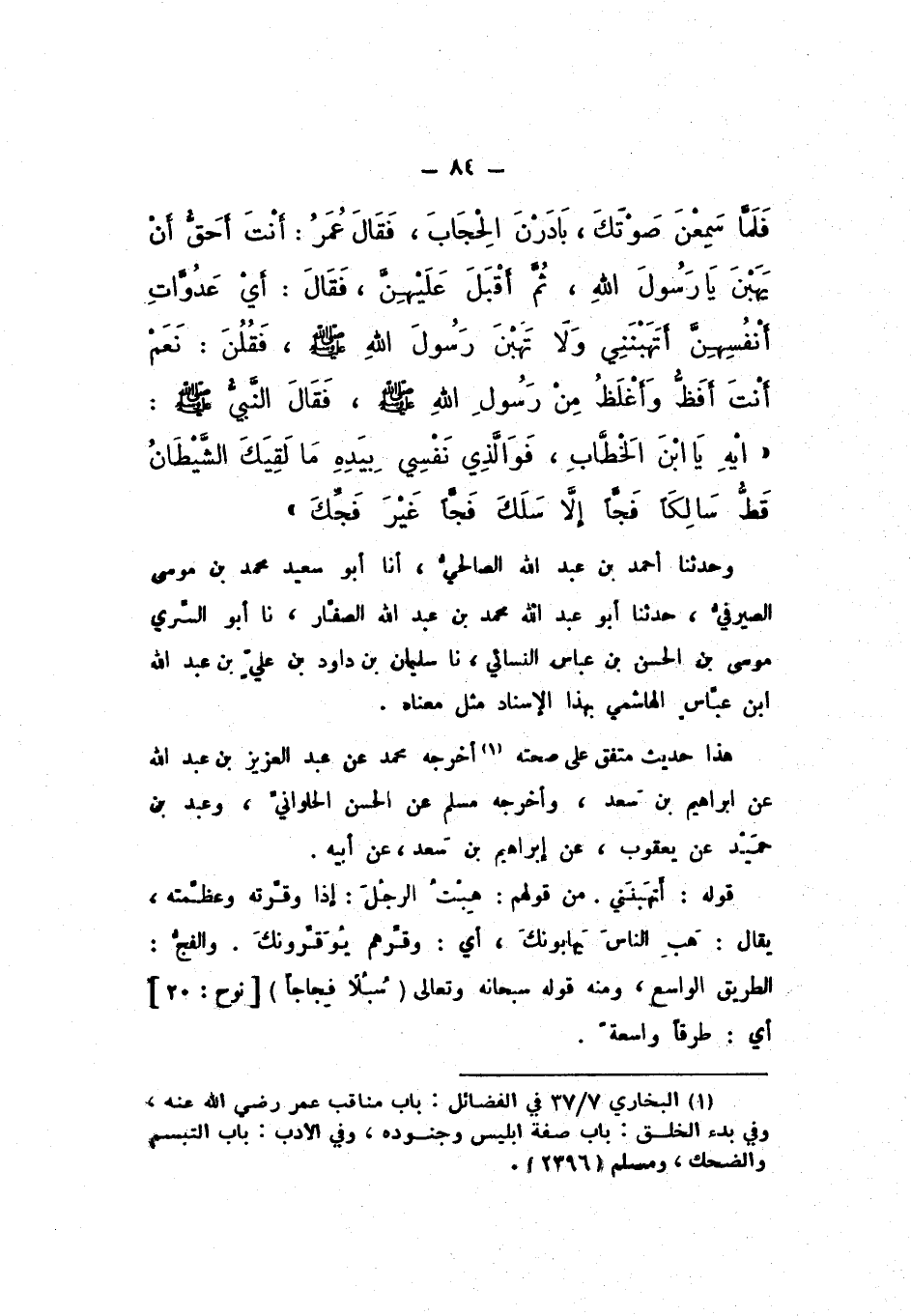 فَلَمَّا سَمِعْنَ صَوْتَكَ، بَادَرْنَ الْحِجَابَ»، فَقَالَ عُمَرُ: أَنْتَ أَحَقُّ أَنْ يَهَبْنَ يَا رَسُولَ اللَّهِ، ثُمَّ أَقْبَلَ عَلَيْهِنَّ، فَقَالَ: أَيْ عَدُوَّاتِ أَنْفُسِهِنَّ، أَتَهَبْنَنِي وَلا تَهَبْنَ رَسُولَ اللَّهِ صَلَّى اللهُ عَلَيْهِ وَسَلَّمَ فَقُلْنَ: نَعَمْ، أَنْتَ أَفَظُّ وَأَغْلَظُ مِنْ رَسُولِ اللَّهِ صَلَّى اللهُ عَلَيْهِ وَسَلَّمَ فَقَالَ النَّبِيُّ صَلَّى اللهُ عَلَيْهِ وَسَلَّمَ: «إِيهِ يَا ابْنَ الْخَطَّابِ، فَوَالَّذِي نَفْسِي بِيَدِهِ، مَا لَقِيَكَ الشَّيْطَانُ قَطُّ سَالِكًا فَجًّا إِلا سَلَكَ فَجًّا غَيْرَ فَجِّكَ».