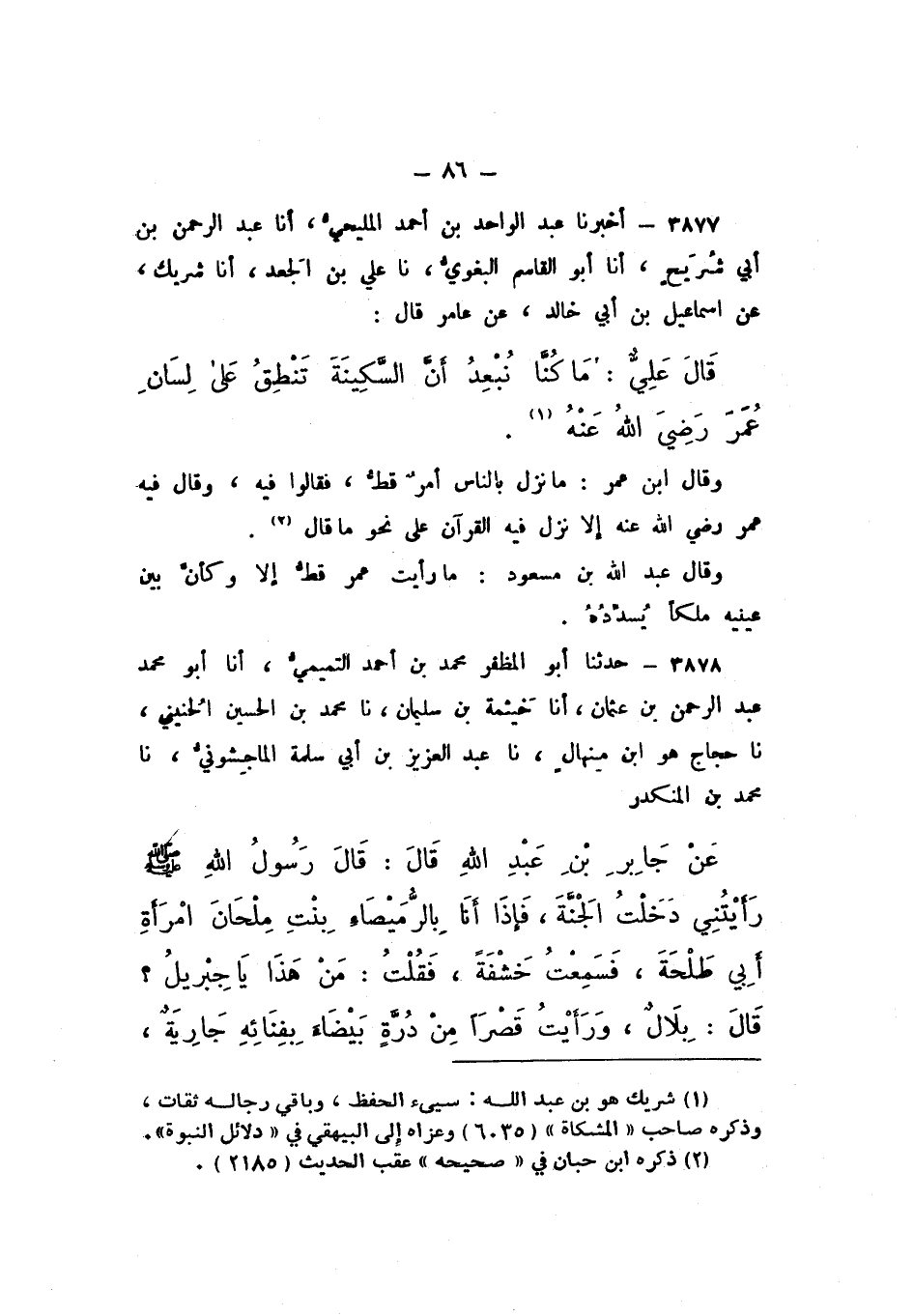 3877 - أَخْبَرَنَا عَبْدُ الْوَاحِدِ بْنُ أَحْمَدَ الْمَلِيحِيُّ، أَنَا عَبْدُ الرَّحْمَنِ بْنُ أَبِي شُرَيْحٍ، أَنَا أَبُو الْقَاسِمِ الْبَغَوِيُّ، نَا عَلِيُّ بْنُ الْجَعْدِ، أَنَا شَرِيكٌ , عَنْ إِسْمَاعِيلَ بْنِ أَبِي خَالِدٍ، عَنْ عَامِرٍ، قَالَ: قَالَ عَلِيٌّ: «مَا كُنَّا نُبْعِدُ أَنَّ السَّكِينَةَ تَنْطِقُ عَلَى لِسَانِ عُمَرَ رَضِيَ اللَّهُ عَنْهُ»