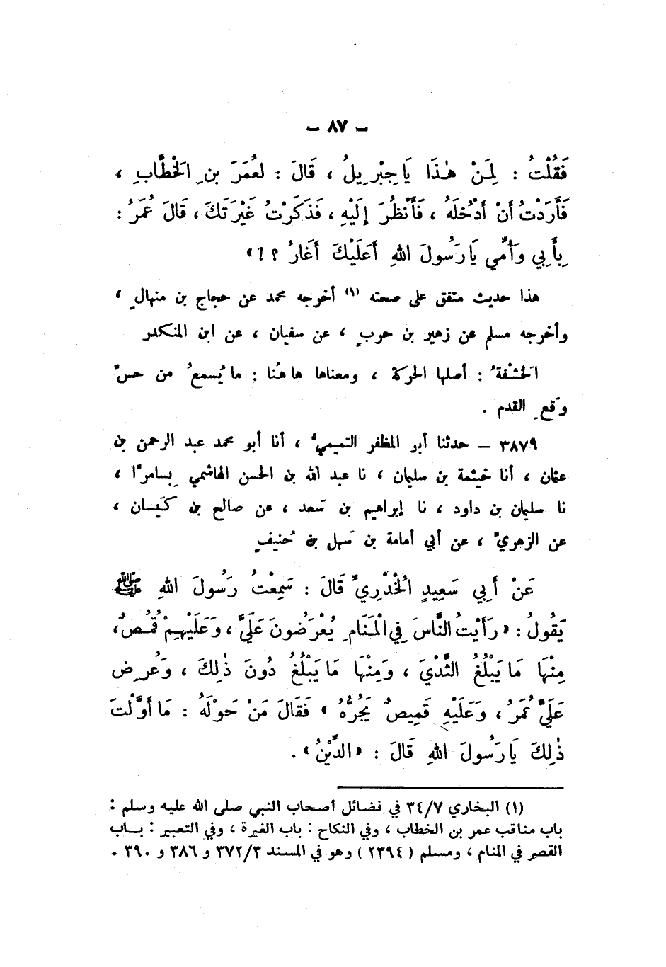 3879 - حَدَّثَنَا أَبُو الْمُظَفَّرِ التَّمِيمِيُّ، أَنَا أَبُو مُحَمَّدٍ عَبْدُ الرَّحْمَنِ بْنُ عُثْمَانَ، أَنَا خَيْثَمَةُ بْنُ سُلَيْمَانَ، نَا عَبْدُ اللَّهِ بْنُ الْحَسَنِ الْهَاشِمِيُّ، بِسَامَرَّا، نَا سُلَيْمَانُ بْنُ دَاوُدَ، نَا إِبْرَاهِيمُ بْنُ سَعْدٍ، عَنْ صَالِحِ بْنِ كَيْسَانَ، عَنِ الزُّهْرِيِّ، عَنْ أَبِي أُمَامَةَ بْنِ سَهْلِ بْنِ حُنَيفٍ، عَنْ أَبِي سَعِيدٍ الْخُدْرِيِّ، قَالَ: سَمِعْتُ رَسُولَ اللَّهِ صَلَّى اللهُ عَلَيْهِ وَسَلَّمَ يَقُولُ: «رَأَيْتُ النَّاسَ فِي الْمَنَامِ يُعْرَضُونَ عَلَيَّ، وَعَلَيْهِمْ قُمُصٌ، مِنْهَا مَا يَبْلُغُ الثَّدْيَ، وَمِنْهَا مَا يَبْلُغُ دُونَ ذَلِكَ، وَعُرِضَ عَلَيَّ عُمَرَ، وَعَلَيْهِ قَمِيصٌ يَجُرُّهُ»، فَقَالَ مَنْ حَوْلَهُ: مَا أَوَّلْتَ ذَلِكَ يَا رَسُولَ اللَّهِ، قَالَ: «الدِّينُ».