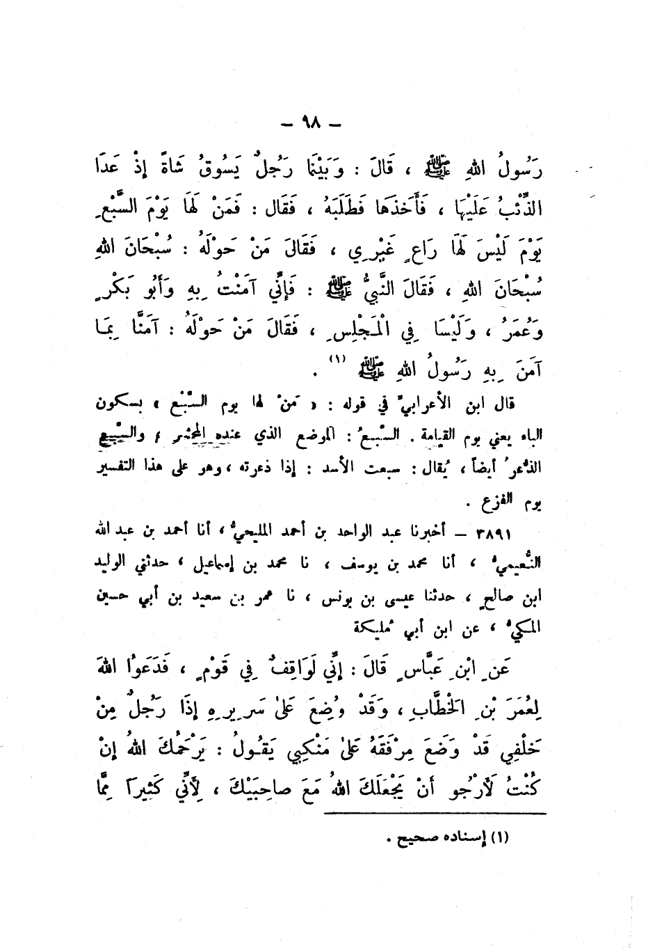 رَسُولُ اللَّهِ صَلَّى اللهُ عَلَيْهِ وَسَلَّمَ وَقَالَ: وَبَيْنَمَا رَجُلٌ يَسُوقُ شَاةً إِذْ عَدَا الذِّئْبُ عَلَيْهَا، فَأَخَذَهَا فَطَلَبَهُ، فَقَالَ: فَمَنْ لَها يَوْمَ السَّبْعِ يَوْمَ لَيْسَ لَهَا رَاعٍ غَيْرِي، فَقَالَ مَنْ حَوْلَهُ: سُبْحَانَ اللَّهِ، سُبْحَانَ اللَّهِ، فَقَالَ النَّبِيُّ صَلَّى اللهُ عَلَيْهِ وَسَلَّمَ: فَإِنِّي آمَنْتُ بِه، وَأَبُو بَكْرٍ، وَعُمَرُ، وَلَيْسَا فِي الْمَجْلِسِ، فَقَالَ مَنْ حَوْلَهُ: آمَنَّا بِمَا آمَنَ بِهِ رَسُولُ اللَّهِ صَلَّى اللهُ عَلَيْهِ وَسَلَّمَ "