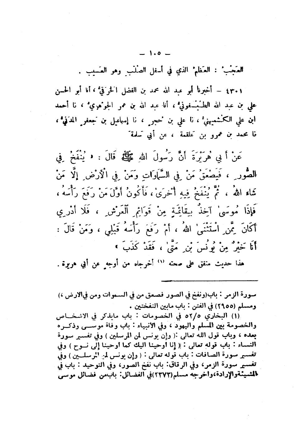 4301 - أَخْبَرَنَا أَبُو عَبْدِ اللَّهِ مُحَمَّدُ بْنُ الْفَضْلِ الْخِرَقِيُّ , أَنَا أَبُو الْحَسَنِ عَلِيُّ بْنُ عَبْدِ اللَّهِ الطَّيْسَفُونِيُّ، أَنَا عَبْدُ اللَّهِ بْنُ عُمَرَ الْجَوْهَرِيُّ، نَا أَحْمَدُ بْنُ عَلِيٍّ الْكُشْمِيهَنِيُّ، نَا عَلِيُّ بْنُ حُجْرٍ، نَا إِسْمَاعِيلُ بْنُ جَعْفَرٍ الْمَدَنِيُّ، نَا مُحَمَّدُ بْنُ عَمْرِو بْنِ عَلْقَمَةَ، عَنْ أَبِي سَلَمَةَ، عَنْ أَبِي هُرَيْرَةَ، أَنّ رَسُولَ اللَّهِ صَلَّى اللهُ عَلَيْهِ وَسَلَّمَ قَالَ: " يُنْفَخُ فِي الصُّورِ، فَيُصْعَقُ مَنْ فِي السَّمَوَاتِ وَمَنْ فِي الأَرْضِ إِلا مَنْ شَاءَ اللَّهُ، ثُمَّ يُنْفَخُ فِيهِ أُخْرَى، فَأَكُونُ أَوَّلَ مَنْ رَفَعَ رَأْسَهُ، فَإِذَا مُوسَى آخِذٌ بِقَائِمَةٍ مِنْ قَوَائِمِ الْعَرْشِ، فَلا أَدْرِي أَكَانَ مِمَّنِ اسْتَثْنَى اللَّهُ، أَمْ رَفَعَ رَأْسَهُ قَبْلِي، وَمَنْ قَالَ: أَنَا خَيْرٌ مِنْ يُونُسَ بْنِ مَتَّى، فَقَدْ كَذَبَ ".
