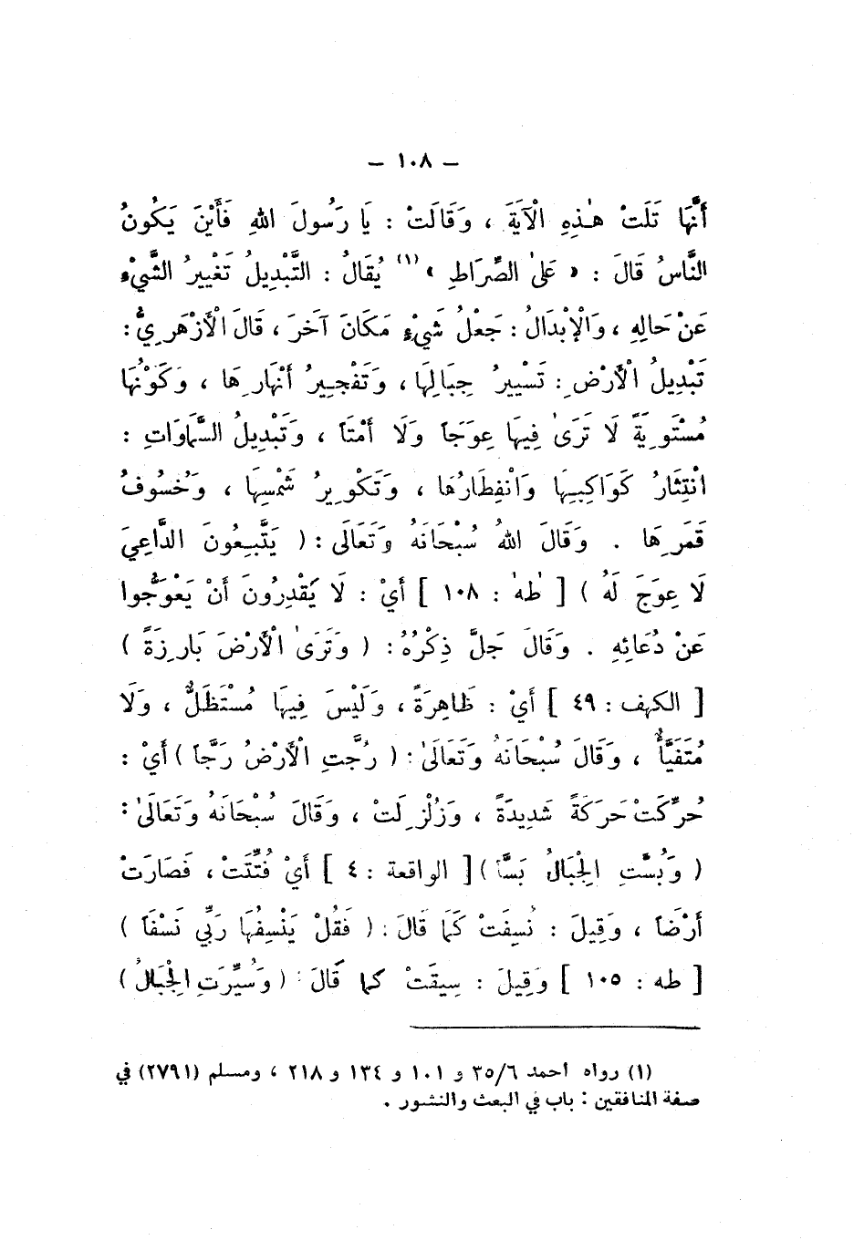 أَنَّهَا تلت هَذِهِ الْآيَة، وَقَالَتْ: يَا رَسُولَ اللَّهِ، فَأَيْنَ يَكُون النَّاسُ؟ قَالَ: «عَلَى الصِّرَاطِ».