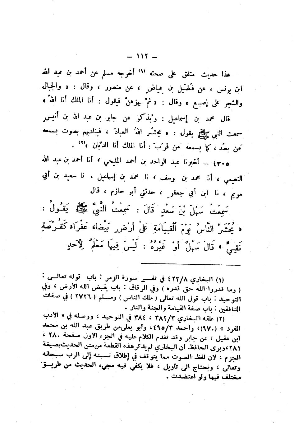 4305 - أَخْبَرَنَا عَبْدُ الْوَاحِدِ بْنُ أَحْمَدَ الْمَلِيحِيُّ، أَنَا أَحْمَدُ بْنُ عَبْدِ اللَّهِ النُّعَيْمِيُّ، أَنَا مُحَمَّدُ بْنُ يُوسُفَ، نَا مُحَمَّدُ بْنُ إِسْمَاعِيلَ، نَا سَعِيدُ بْنُ أَبِي مَرْيَمَ، نَا ابْنُ أَبِي جَعْفَرٍ، حَدَّثَنِي أَبُو حَازِمٍ، قَالَ: سَمِعْتُ سَهْلَ بْنَ سَعْدٍ، قَالَ: سَمِعْتُ النَّبِيَّ صَلَّى اللهُ عَلَيْهِ وَسَلَّمَ، يَقُولُ: «يُحْشَرُ النَّاسُ يَوْمَ الْقِيَامَةِ عَلَى أَرْضٍ بَيْضَاءَ عَفْرَاءَ كَقُرْصَةِ نَقِيٍّ»، قَالَ سَهْلٌ أَوْ غَيْرُهُ: لَيْسَ فِيهَا مَعْلَمٌ لأَحَدٍ.