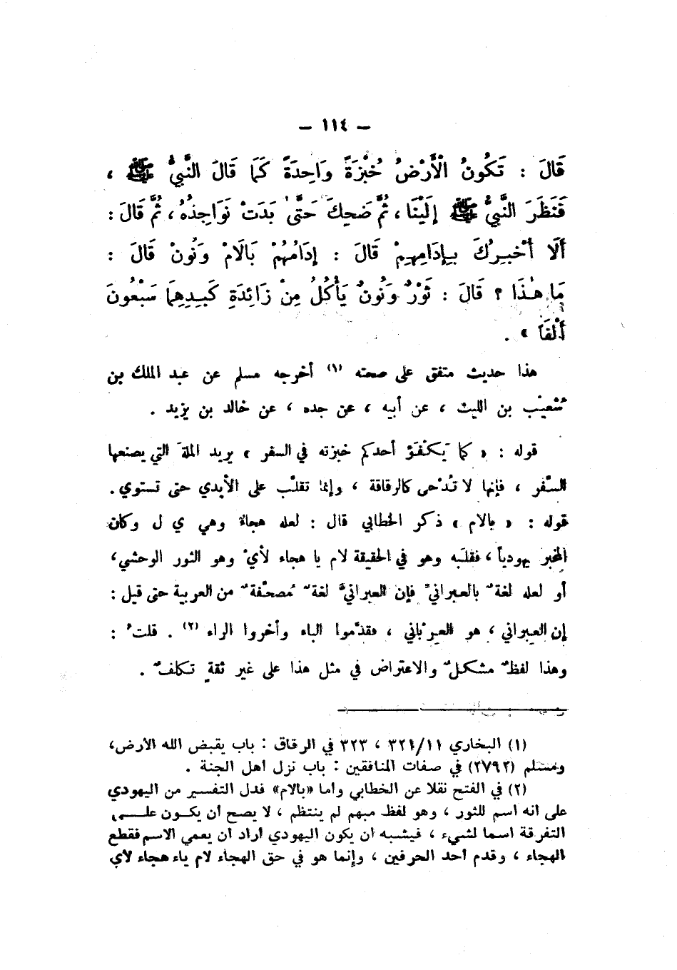 قَالَ: تَكُونُ الأَرْضِ خُبْزَةً وَاحِدَةً، كَمَا قَالَ النَّبِيُّ صَلَّى اللهُ عَلَيْهِ وَسَلَّمَ، فَنَظَرَ النَّبِيُّ صَلَّى اللهُ عَلَيْهِ وَسَلَّمَ إِلَيْنَا، ثُمَّ ضَحِكَ حَتَّى بَدَتْ نَوَاجِذُهُ، ثُمَّ قَالَ: أَلا أُخْبِرُكَ بِإِدَامِهِمْ، قَالَ: إِدَامُهُمْ بَالَام وَنُونٌ.