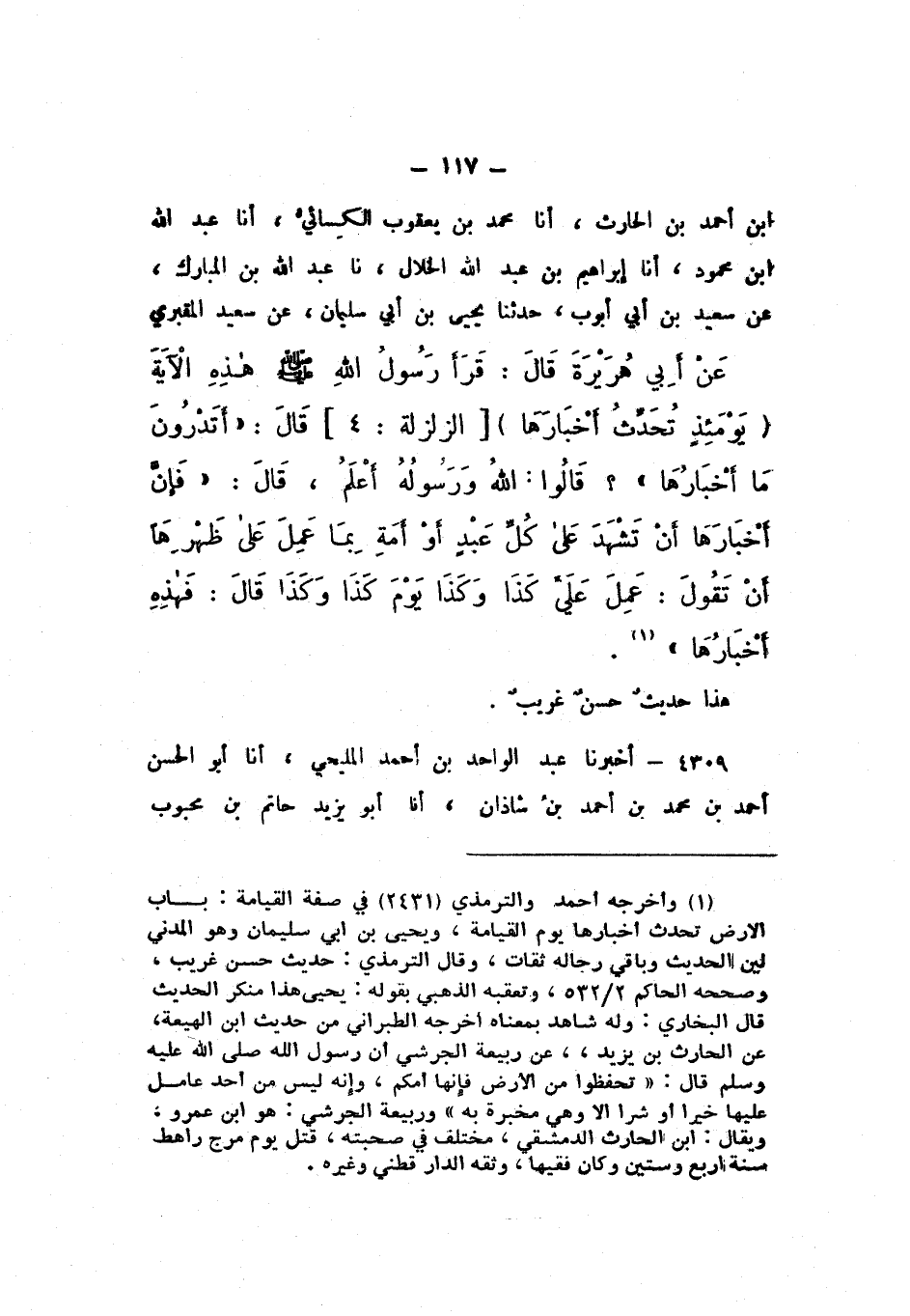 بْنُ أَحْمَدَ بْنِ الْحَارِثِ، أَنَا مُحَمَّدُ بْنُ يَعْقُوبَ الْكِسَائِيُّ، أَنَا عَبْدُ اللَّهِ بْنُ مَحْمُودٍ، أَنَا إِبْرَاهِيمُ بْنُ عَبْدِ اللَّهِ الْخَلالُ، نَا عَبْدُ اللَّهِ بْنُ الْمُبَارَكِ، عَنْ سَعِيدِ بْنِ أَبِي أَيُّوبَ، حَدَّثَنَا يَحْيَى بْنُ أَبِي سُلَيْمَانَ، عَنْ سَعِيدٍ الْمَقْبُرِيِّ، عَنْ أَبِي هُرَيْرَةَ، قَالَ: " قَرَأَ رَسُولُ اللَّهِ صَلَّى اللهُ عَلَيْهِ وَسَلَّمَ هَذِهِ الآيَةَ: {يَوْمَئِذٍ تُحَدِّثُ أَخْبَارَهَا} [الزلزلة: 4]، قَالَ: «أَتَدْرُونَ مَا أَخْبَارُهَا؟» قَالُوا: اللَّهُ وَرَسُولُهُ أَعْلَمُ.