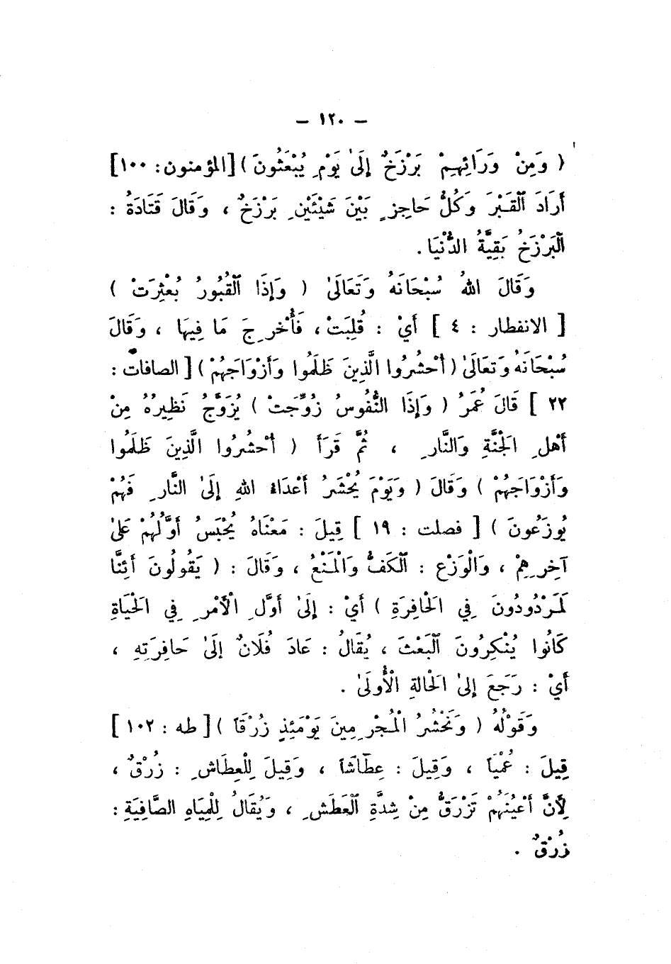 قَالَ عُمَرُ: {وَإِذَا النُّفُوسُ زُوِّجَتْ} [التكوير: 7] يُزَوّج نَظِيره مِنْ أَهْلِ الْجَنَّةِ وَالنَّار، ثُمَّ قَرَأَ: {احْشُرُوا الَّذِينَ ظَلَمُوا وَأَزْوَاجَهُمْ} [الصافات: 22]، وَقَالَ: {وَيَوْمَ يُحْشَرُ أَعْدَاءُ اللَّهِ إِلَى النَّارِ فَهُمْ يُوزَعُونَ} [فصلت: 19]، قِيلَ: مَعْنَاهُ يحبس أَوَّلهمْ عَلَى آخِرهم، والوزع: الْكَفّ وَالْمَنْع، وَقَالَ: {يَقُولُونَ أَئِنَّا لَمَرْدُودُونَ فِي الْحَافِرَةِ} [النازعات: 10]، أَي: إِلَى أول الْأَمر فِي الْحَيَاة، كَانُوا يُنكرُونَ الْبَعْث، يُقَالُ: عَاد فُلان إِلَى حافرته، أَي: رَجَعَ إِلَى الْحَالة الأولى.