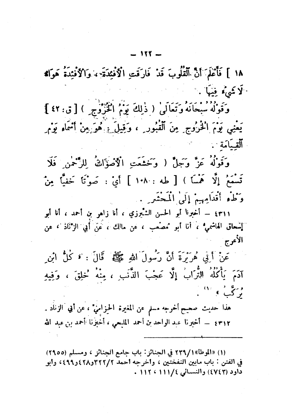 4311 - أَخْبَرَنَا أَبُو الْحَسَنِ الشِّيرَزِيُّ، أَنَا زَاهِرُ بْنُ أَحْمَدَ، أَنَا أَبُو إِسْحَاقَ الْهَاشِمِيُّ، أَنَا أَبُو مُصْعَبٍ، عَنْ مَالِكٍ، عَنْ أَبِي الزِّنَادِ، عَنِ الأَعْرَجِ، عَنْ أَبِي هُرَيْرَةَ، أَنّ رَسُولَ اللَّهِ صَلَّى اللهُ عَلَيْهِ وَسَلَّمَ، قَالَ: «كُلُّ ابْنِ آدَمَ يَأْكُلُهُ التُّرَابُ إِلا عَجْبَ الذَّنَبِ، مِنْهُ خُلِقَ، وَفِيهِ يُرَكَّبُ».