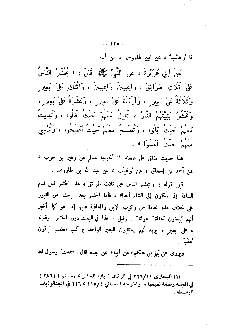 نَا وُهَيْبٌ، عَنِ ابْنِ طَاوُسٍ، عَنْ أَبِيهِ، عَنْ أَبِي هُرَيْرَةَ، عَنِ النَّبِيِّ صَلَّى اللهُ عَلَيْهِ وَسَلَّمَ، قَالَ: " يُحْشَرُ النَّاسُ عَلَى ثَلاثِ طَرَائِقَ: رَاغِبِينَ رَاهِبِينَ، وَاثْنَانِ عَلَى بَعِيرٍ، وَثَلاثَةٌ عَلَى بَعِيرٍ، وَأَرْبَعَةٌ عَلَى بَعِيرٍ، وَعَشَرَةٌ عَلَى بَعِيرٍ، وَتَحْشُرُ بَقِيَّتَهُمُ النَّارُ، تَقِيلُ مَعَهُمْ حَيْثُ قَالُوا، وَتَبِيتُ مَعَهُمْ حَيْثُ بَاتُوا، وَتُصْبِحُ مَعَهُمْ حَيْثُ أَصْبَحُوا، وَتُمْسِي مَعَهُمْ حَيْثُ أَمْسَوْا ".