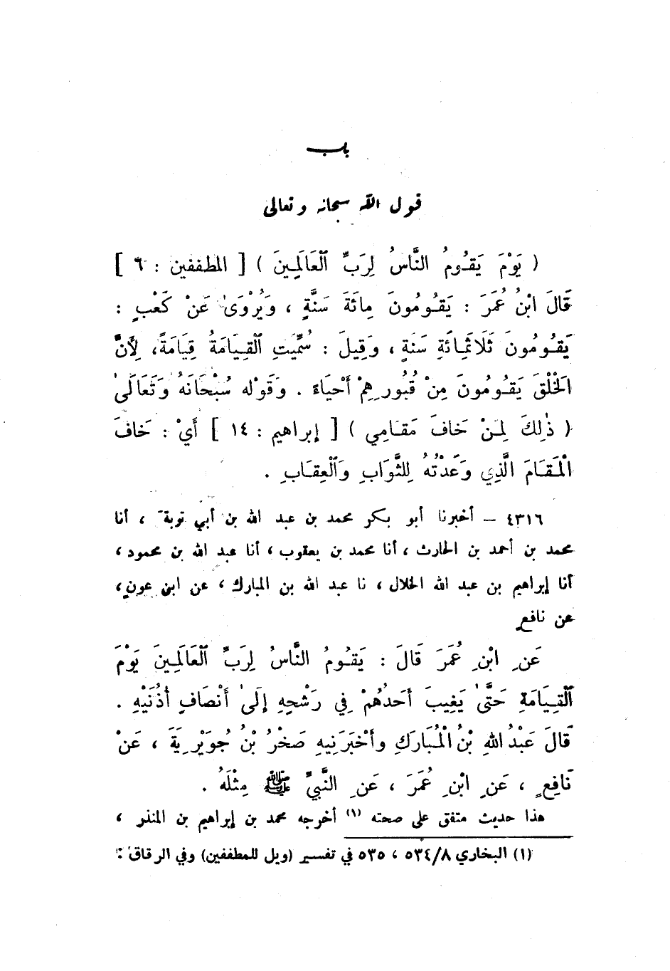 4316 - أَخْبَرَنَا أَبُو بَكْرٍ مُحَمَّدُ بْنُ عَبْدِ اللَّهِ بْنِ أَبِي تَوْبَةَ، أَنَا مُحَمَّدُ بْنُ أَحْمَدَ بْنِ الْحَارِثِ، أَنَا مُحَمَّدُ بْنُ يَعْقُوبَ، أَنَا عَبْدُ اللَّهِ بْنُ مَحْمُودٍ، أَنَا إِبْرَاهِيمُ بْنُ عَبْدِ اللَّهِ الْخَلالُ، نَا عَبْدُ اللَّهِ بْنُ الْمُبَارَكِ، عَنِ ابْنِ عَوْنٍ، عَنْ نَافِعٍ، عَنِ ابْنِ عُمَرَ، قَالَ: «يَقُومُ النَّاسُ لِرَبِّ الْعَالَمِينَ يَوْمَ الْقِيَامَةِ، حَتَّى يَغِيبَ أَحَدُهُمْ فِي رَشْحِهِ إِلَى أَنْصَافِ أُذُنَيْهِ».