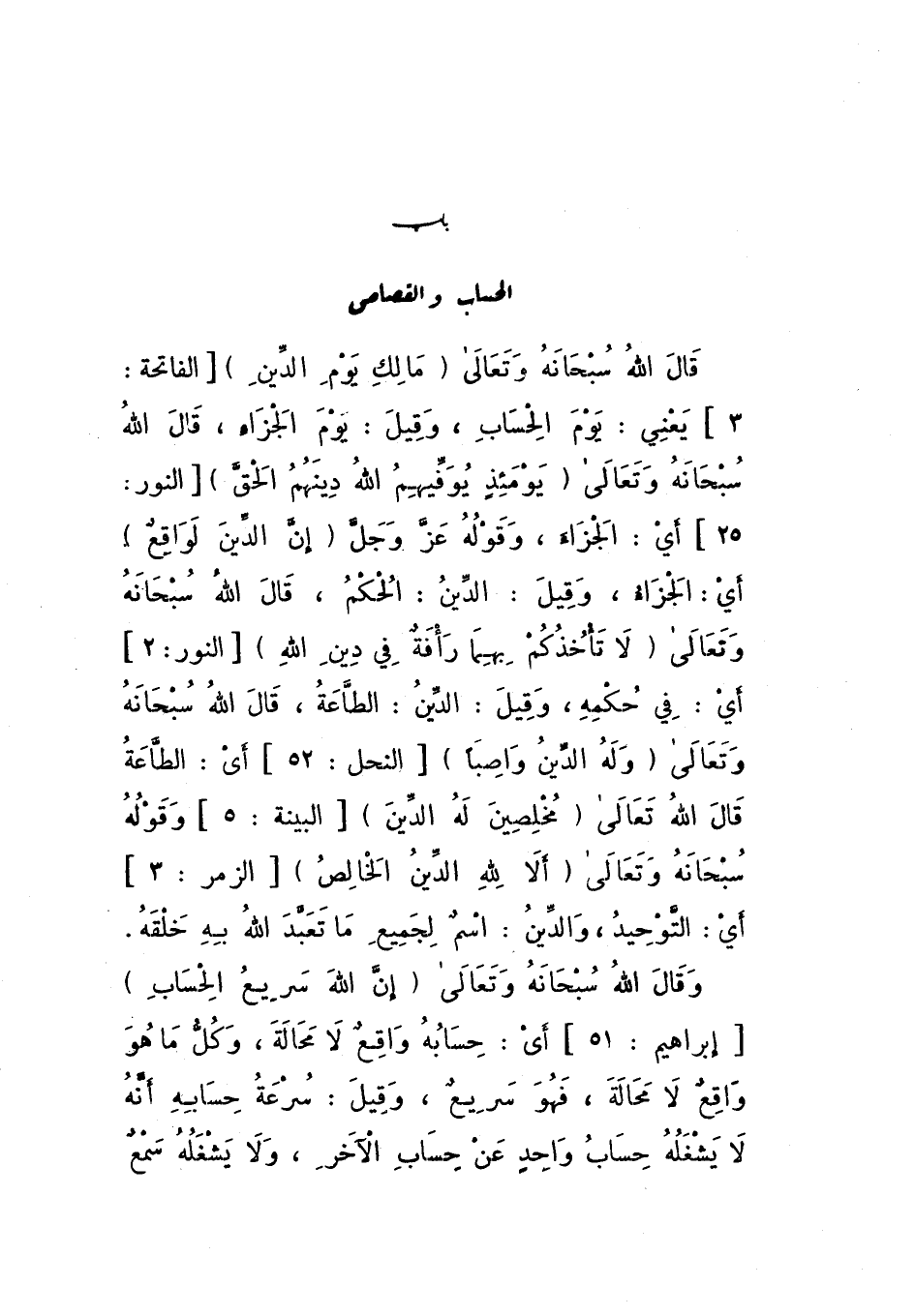 قَالَ اللَّهُ سُبْحَانَهُ وَتَعَالَى: {مَالِكِ يَوْمِ الدِّينِ} [الْفَاتِحَة: 4]، يَعْنِي: يَوْم الْحساب، وَقِيلَ: يَوْم الْجَزَاء.
