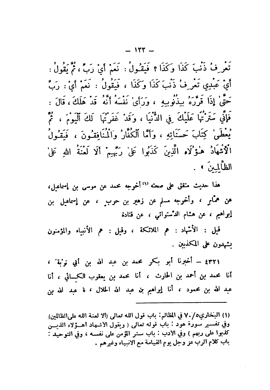 وَأَمَّا الْكُفَّارُ وَالْمُنَافِقُونَ، فَيَقُولُ الأَشْهَادُ: هَؤُلاءِ الَّذِينَ كَذَبُوا عَلَى رَبِّهِمْ، أَلا لَعْنَةُ اللَّهِ عَلَى الظَّالِمِينَ ".