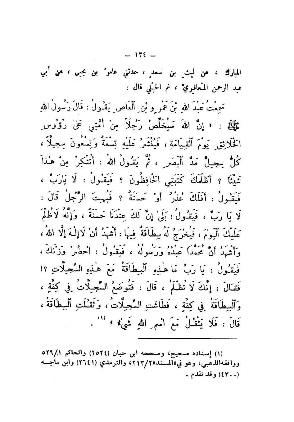 الْمُبَارَكِ، عَنْ ليثِ بْنِ سَعْدٍ، حَدَّثَنِي عَامِرُ بْنُ يَحْيَى، عَنْ أَبِي عَبْدِ الرَّحْمَنِ الْمَعَافِرِيِّ، ثُمَّ الْحُبُلِيِّ، قَالَ: سَمِعْتُ عَبْدَ اللَّهِ بْنَ عَمْرِو بْنِ الْعَاصِ، يَقُولُ: قَالَ رَسُولُ اللَّهِ صَلَّى اللهُ عَلَيْهِ وَسَلَّمَ: " إِنَّ اللَّهَ سَيُخَلِّصُ رَجُلا مِنْ أُمَّتِي عَلَى رُءُوسِ الْخَلائِقِ يَوْمَ الْقِيَامَةِ، فَيَنْشُرُ عَلَيْهِ تِسْعَةٌ وَتِسْعُونَ سِجِلا، كُلُّ سَجِلّ مَدَّ الْبَصَرِ، ثُمَّ يَقُولُ اللَّهُ: أَتُنْكِرُ مِنْ هَذَا شَيْئًا؟ أَظَلَمَكَ كَتَبَتِي الْحَافِظُونَ؟ فَيَقُولُ: لَا يَا رَبِّ.