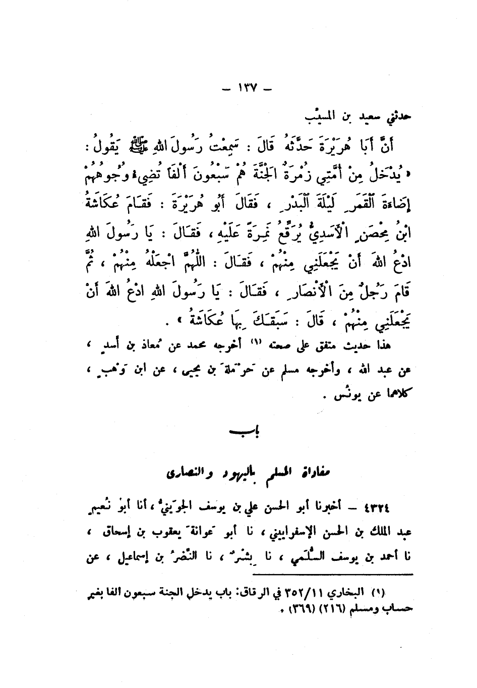 حَدَّثَنِي سَعِيدُ بْنُ الْمُسَيِّبِ، أَنَّ أَبَا هُرَيْرَةَ، حَدَّثَهُ , قَالَ: سَمِعْتُ رَسُولَ اللَّهِ صَلَّى اللهُ عَلَيْهِ وَسَلَّمَ، يَقُولُ: «يَدْخُلُ مِنْ أُمَّتِي زُمْرَةٌ الْجَنَّةَ، هُمْ سَبْعُونَ أَلْفًا تُضِيءُ وُجُوهُهُمْ إِضَاءَةَ الْقَمَرِ لَيْلَةَ الْبَدْرِ»، فَقَالَ أَبُو هُرَيْرَةَ: فَقَامَ عُكَّاشَةُ بْنُ مِحْصَنٍ الأَسَدِيِّ، يُرَقِّعُ نَمِرَةً عَلَيْهِ، فَقَالَ: يَا رَسُولَ اللَّهِ، ادْعُ اللَّهَ أَنْ يَجْعَلَنِي مِنْهُمْ، فَقَالَ: «اللَّهُمَّ اجْعَلْهُ مِنْهُمْ»، ثُمَّ قَامَ رَجُلٌ مِنَ الأَنْصَارِ، فَقَالَ: يَا رَسُولَ اللَّهِ، ادْعُ اللَّهَ أَنْ يَجْعَلَنِي مِنْهُمْ، قَالَ: «سَبَقَكَ بِهَا عُكَّاشَةُ».