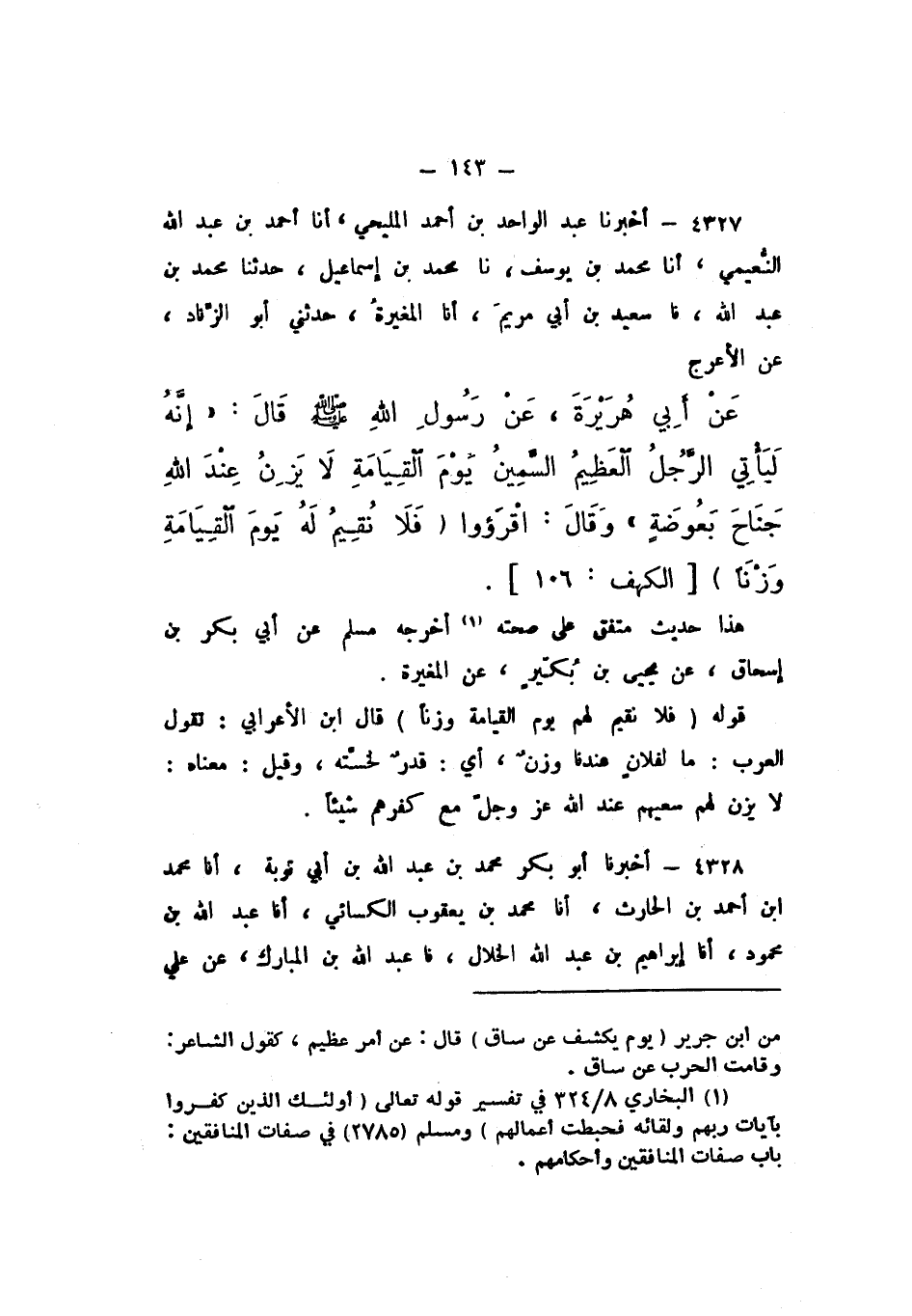 4327 - أَخْبَرَنَا عَبْدُ الْوَاحِدِ بْنُ أَحْمَدَ الْمَلِيحِيُّ، أَنَا أَحْمَدُ بْنُ عَبْدِ اللَّهِ النُّعَيْمِيُّ، أَنَا مُحَمَّدُ بْنُ يُوسُفَ، نَا مُحَمَّدُ بْنُ إِسْمَاعِيلَ، حَدَّثَنَا مُحَمَّدُ بْنُ عَبْدِ اللَّهِ، نَا سَعِيدُ بْنُ أَبِي مَرْيَمَ، أَنَا الْمُغِيرَةُ، حَدَّثَنِي أَبُو الزِّنَادِ، عَنِ الأَعْرَجِ، عَنْ أَبِي هُرَيْرَةَ، عَنْ رَسُولِ اللَّهِ صَلَّى اللهُ عَلَيْهِ وَسَلَّمَ، قَالَ: " إِنَّهُ لَيَأْتِي الرَّجُلُ الْعَظِيمُ السَّمِينُ يَوْمَ الْقِيَامَةِ لَا يَزِنُ عِنْدَ اللَّهِ جَنَاحَ بَعُوضَةٍ، وَقَالَ: اقْرَءُوا: {فَلا نُقِيمُ لَهُمْ يَوْمَ الْقِيَامَةِ وَزْنًا} [الْكَهْف: 105] ".