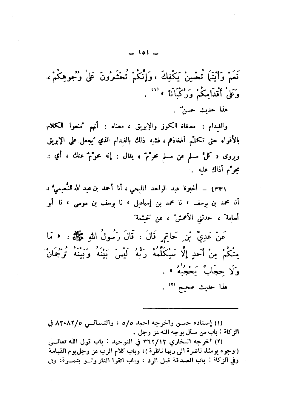 4331 - أَخْبَرَنَا عَبْدُ الْوَاحِدِ الْمَلِيحِيُّ، أَنَا أَحْمَدُ بْنُ عَبْدِ اللَّهِ النُّعَيْمِيُّ، أَنَا مُحَمَّدُ بْنُ يُوسُفَ، نَا مُحَمَّدُ بْنُ إِسْمَاعِيلَ، نَا يُوسُفُ بْنُ مُوسَى، نَا أَبُو أُسَامَةَ، حَدَّثَنِي الأَعْمَشُ، عَنْ خَيْثَمَةَ، عَنْ عَدِيِّ بْنِ حَاتِمٍ، قَالَ: قَالَ رَسُولُ اللَّهِ صَلَّى اللهُ عَلَيْهِ وَسَلَّمَ: «مَا مِنْكُمْ مِنْ أَحَدٍ إِلا سَيُكَلِّمُهُ رَبُّهُ لَيْسَ بَيْنَهُ وَبَيْنَهُ تُرْجُمَانٌ، وَلا حِجَابٌ يَحْجُبُهُ».