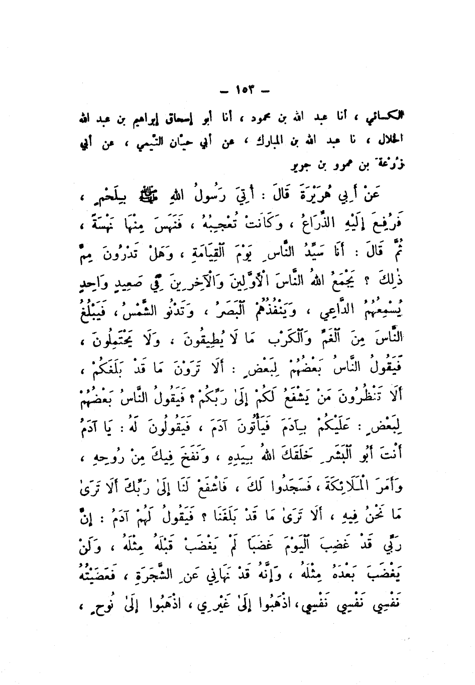 الْكِسَائِيُّ، أَنَا عَبْدُ اللَّهِ بْنُ مَحْمُودٍ، أَنَا أَبُو إِسْحَاقَ إِبْرَاهِيمُ بْنُ عَبْدِ اللَّهِ الْخَلالُ، نَا عَبْدُ اللَّهِ بْنُ الْمُبَارَكِ، عَنْ أَبِي حَيَّانَ التَّيْمِيِّ، عَنْ أَبِي زُرْعَةَ بْنِ عَمْرِو بْنِ جَرِيرٍ، عَنْ أَبِي هُرَيْرَةَ، قَالَ: أُتِيَ رَسُولُ اللَّهِ صَلَّى اللهُ عَلَيْهِ وَسَلَّمَ بِلَحْمٍ، فَرُفِعَ إِلَيْهِ الذِّرَاعُ، وَكَانَتْ تُعْجِبُهُ، فَنَهَسَ مِنْهَا نَهْسَةً، ثُمَّ قَالَ: " أَنَا سَيِّدُ النَّاسِ يَوْمَ الْقِيَامَةِ، وَهَلْ تَدْرُونَ مِمَّ ذَلِكَ؟ يَجْمَعُ اللَّهُ النَّاسَ الأَوَّلِينَ وَالآخِرِينَ فِي صَعِيدٍ وَاحِدٍ يُسْمِعُهُمُ الدَّاعِي، وَيَنْفُذُهُمُ الْبَصَرُ، وَتَدْنُو الشَّمْسُ، فَيَبْلُغُ النَّاسُ مِنَ الْغَمِّ وَالْكَرْبِ مَا لَا يُطِيقُونَ، وَلا يَحْتَمِلُونَ، فَيَقُولُ النَّاسُ بَعْضُهُمْ لِبَعْضٍ: أَلا تَرَوْنَ مَا قَدْ بَلَغَكُمْ؟ أَلا تَنْظُرُونَ مَنْ يَشْفَعُ لَكُمْ إِلَى رَبِّكُمْ؟ فَيَقُولُ النَّاسُ بَعْضُهُمْ لِبَعْضٍ: عَلَيْكُمْ بِآدَمَ، فَيَأْتُونَ آدَمَ، فَيَقُولُونَ لَهُ: يَا آدَمُ، أَنْتَ أَبُو الْبَشَرِ خَلَقَكَ اللَّهُ بِيَدِهِ، وَنَفَخَ فِيكَ مِنْ رُوحِهِ، وَأَمَرَ الْمَلائِكَةَ، فَسَجَدُوا لَكَ، فَاشْفَعْ لَنَا إِلَى رَبِّكَ، أَلا تَرَى مَا نَحْنُ فِيهِ؟ أَلا تَرَى مَا قَدْ بَلَغَنَا؟ فَيَقُولُ لَهُمْ آدَمُ: إِنَّ رَبِّي قَدْ غَضِبَ الْيَوْمَ غَضَبًا، لَمْ يَغْضَبْ قَبْلَهُ مِثْلَهُ، وَلَنْ يَغْضَبَ بَعْدَهُ مِثْلَهُ، وَإِنَّهُ قَدْ نَهَانِي عَنِ الشَّجَرَةِ، فَعَصَيْتُهُ، نَفْسِي نَفْسِي نَفْسِي، اذْهَبُوا إِلَى غَيْرِي، اذْهَبُوا إِلَى نُوحٍ.