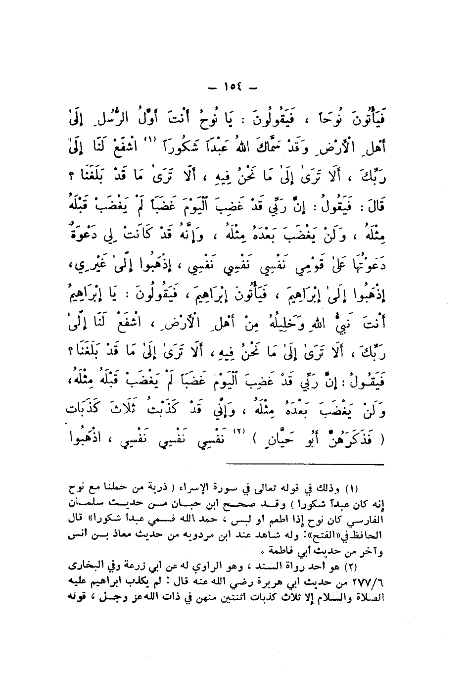 فَيَأْتُونَ نُوحًا، فَيَقُولُونَ: يَا نُوحُ، أَنْتَ أَوَّلُ الرُّسُلِ إِلَى أَهْلِ الأَرْضِ، وَقَدْ سَمَّاكَ اللَّهُ عَبْدًا شَكُورًا، اشْفَعْ لَنَا إِلَى رَبِّكَ، أَلا تَرَى إِلَى مَا نَحْنُ فِيهِ؟ أَلا تَرَى مَا قَدْ بَلَغَنَا؟ قَالَ: فَيَقُولُ: إِنَّ رَبِّي قَدْ غَضِبَ الْيَوْمَ غَضَبًا، لَمْ يَغْضَبْ قَبْلَهُ مِثْلَهُ، وَلَنْ يَغْضَبَ بَعْدَهُ مِثْلَهُ، وَإِنَّهُ قَدْ كَانَتْ لِي دَعْوَةٌ دَعَوْتُهَا عَلَى قَوْمِي، نَفْسِي نَفْسِي نَفْسِي، اذْهَبُوا إِلَى غَيْرِي، اذْهَبُوا إِلَى إِبْرَاهِيمَ.
