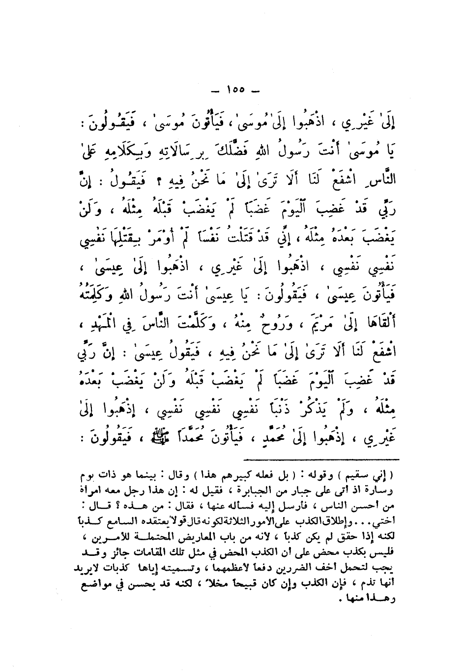 فَيَأْتُونَ مُوسَى، فَيَقُولُونَ: يَا مُوسَى، أَنْتَ رَسُولُ اللَّهِ، فَضَّلَكَ بِرِسَالاتِهِ وَبِكَلامِهِ عَلَى النَّاسِ، اشْفَعْ لَنَا إِلَى رَبِّكَ، أَلا تَرَى إِلَى مَا نَحْنُ فِيهِ؟ فَيَقُولُ: إِنَّ رَبِّي قَدْ غَضِبَ الْيَوْمَ غَضَبًا، لَمْ يَغْضَبْ قَبْلَهُ مِثْلَهُ، وَلَنْ يَغْضَبَ بَعْدَهُ مِثْلَهُ، إِنِّي قَدْ قَتَلْتُ نَفْسًا لَمْ أُؤْمَرْ بِقَتْلِهَا، نَفْسِي نَفْسِي نَفْسِي، اذْهَبُوا إِلَى غَيْرِي، اذْهَبُوا إِلَى عِيسَى.