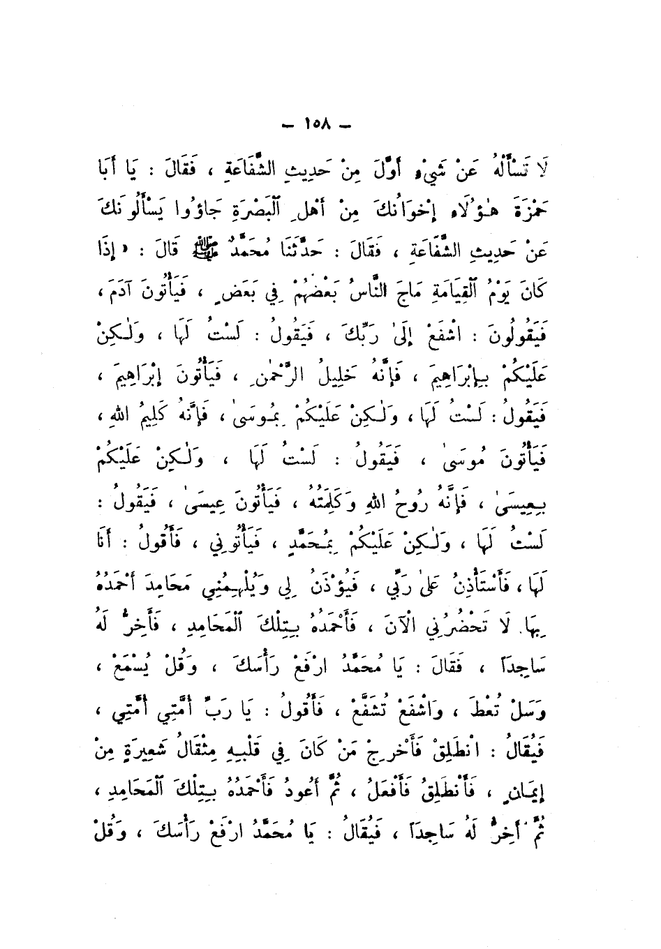 لَا تَسْأَلْهُ عَنْ شَيْءٍ أَوَّلَ مِنْ حَدِيثِ الشَّفَاعَةِ، فَقَالَ: يَا أَبَا حَمْزَةَ، هَؤُلاءِ إِخْوَانُكَ مِنْ أَهْلِ الْبَصْرَةِ جَاءُوا يَسْأَلُونَكَ عَنْ حَدِيثِ الشَّفَاعَةِ، فَقَالَ: حَدَّثَنَا مُحَمَّدٌ صَلَّى اللهُ عَلَيْهِ وَسَلَّمَ، قَالَ: " إِذَا كَانَ يَوْمُ الْقِيَامَةِ مَاجَ النَّاسُ بَعْضُهُمْ فِي بَعْضٍ، فَيَأْتُونَ آدَمَ، فَيَقُولُونَ: اشْفَعْ إِلَى رَبِّكَ، فَيَقُولُ: لَسْتُ لَهَا، وَلَكِنْ عَلَيْكُمْ بِإِبْرَاهِيمَ، فَإِنَّهُ خَلِيلُ الرَّحْمَنِ، فَيَأْتُونَ إِبْرَاهِيمَ، فَيَقُولُ: لَسْتُ لَهَا، وَلَكِنْ عَلَيْكُمْ بِمُوسَى، فَإِنَّهُ كَلِيمُ اللَّهِ، فَيَأْتُونَ مُوسَى، فَيَقُولُ: لَسْتُ لَهَا، وَلَكِنْ عَلَيْكُمْ بِعِيسَى، فَإِنَّهُ رُوحُ اللَّهِ وَكَلِمَتُهُ، فَيَأْتُونَ عِيسَى، فَيَقُولُ: لَسْتُ لَهَا، وَلَكِنْ عَلَيْكُمْ بِمُحَمَّدٍ، فَيَأْتُونِي، فَأَقُولُ: أَنَا لَهَا، فَأَسْتَأْذِنُ عَلَى رَبِّي، فَيُؤْذَنُ لِي، وَيُلْهِمُنِي مَحَامِدَ أَحْمَدُهُ بِهَا، لَا تَحْضُرُنِي الآنَ، فَأَحْمَدُهُ بِتِلْكَ الْمَحَامِدِ، فَأَخِرُّ لَهُ سَاجِدًا، فَقَالَ: يَا مُحَمَّدُ، ارْفَعْ رَأْسَكَ، وَقُلْ يُسْمَعْ، وَسَلْ تُعْطَ، وَاشْفَعْ تُشَفَّعْ، فَأَقُولُ: يَا رَبِّ، أُمَّتِي أُمَّتِي، فَيُقَالُ: انْطَلِقْ، فَأَخْرِجْ مِنْ كَانَ فِي قَلْبِهِ مِثْقَالُ شَعِيرَةٍ مِنْ إِيمَانٍ، فَأَنْطَلِقُ فَأَفْعَلُ، ثُمَّ أَعُودُ فَأَحْمَدُهُ بِتِلْكَ الْمَحَامِدِ، ثُمَّ أَخِرُّ لَهُ سَاجِدًا، فَيُقَالُ: يَا مُحَمَّدُ، ارْفَعْ رَأْسَكَ، وَقُلْ