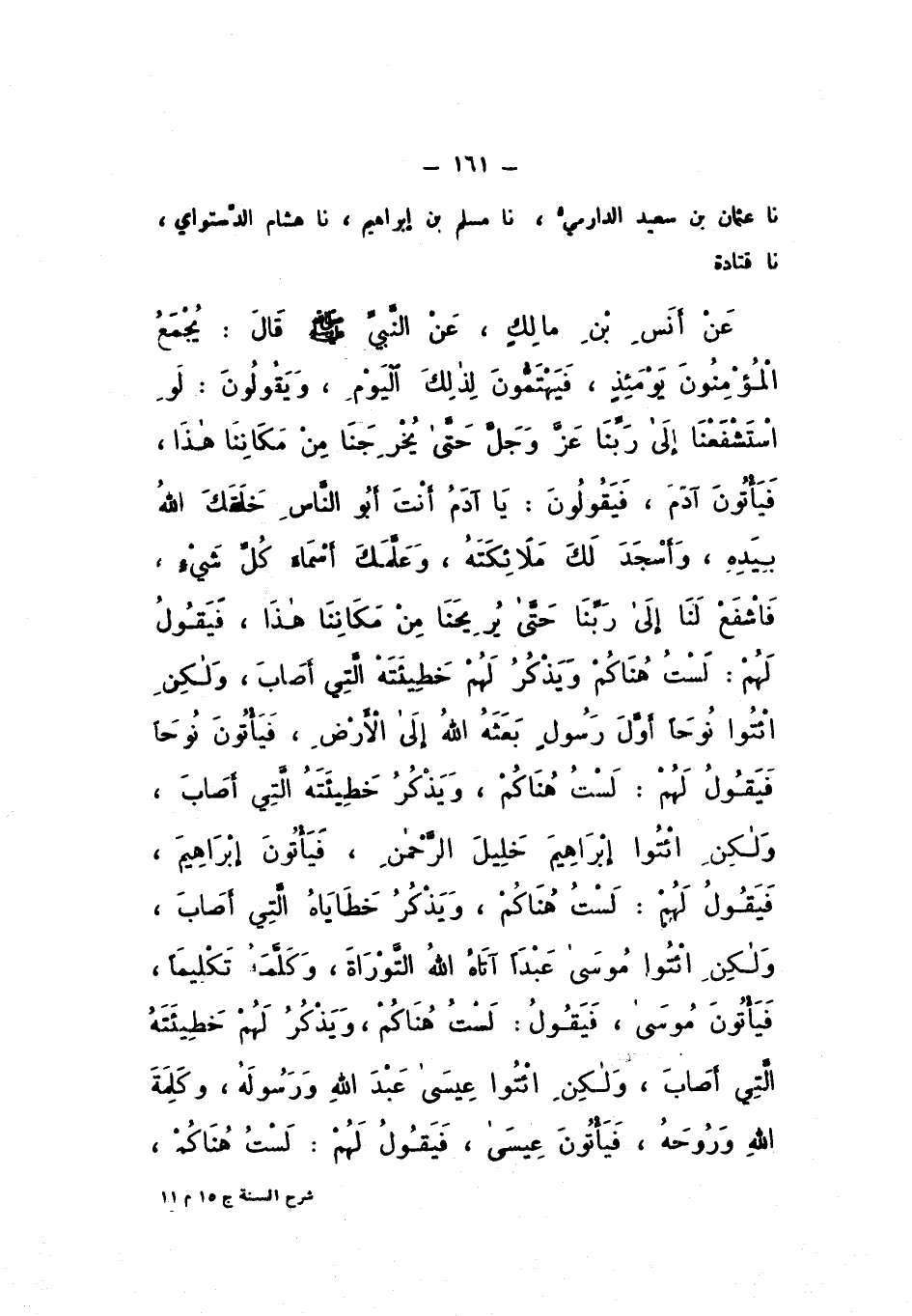 نَا عُثْمَانُ بْنُ سَعِيدٍ الدَّارِمِيُّ، نَا مُسْلِمُ بْنُ إِبْرَاهِيمَ، نَا هِشَامٌ الدَّسْتَوَائِيُّ، نَا قَتَادَةُ، عَنْ أَنَسِ بْنِ مَالِكٍ، عَنِ النَّبِيِّ صَلَّى اللهُ عَلَيْهِ وَسَلَّمَ، قَالَ: " يُجْمَعُ الْمُؤْمِنُونَ يَوْمَئِذٍ، فَيَهْتَمُّونَ لِذَلِكَ الْيَوْمِ، وَيَقُولُونَ: لَوِ اسْتَشْفَعْنَا إِلَى رَبِّنَا عَزَّ وَجَلَّ حَتَّى يُخْرِجَنَا مِنْ مَكَانِنَا هَذَا، فَيَأْتُونَ آدَمَ، فَيَقُولُونَ: يَا آدَمُ، أَنْتَ أَبُو النَّاسِ خَلَقَكَ اللَّهُ بِيَدِهِ، وَأَسْجَدَ لَكَ مَلائِكَتَهُ، وَعَلَّمَكَ أَسْمَاءَ كُلِّ شَيْءٍ، فَاشْفَعْ لَنَا إِلَى رَبِّنَا حَتَّى يُرِيحَنَا مِنْ مَكَانِنَا هَذَا، فَيَقُولُ لَهُمْ: لَسْتُ هُنَاكُمْ، وَيَذْكُرُ لَهُمْ خَطِيئَتَهُ الَّتِي أَصَابَ، وَلَكِنِ ائْتُوا نُوحًا أَوَّلَ رَسُولٍ بَعَثَهُ اللَّهُ إِلَى الأَرْضِ.