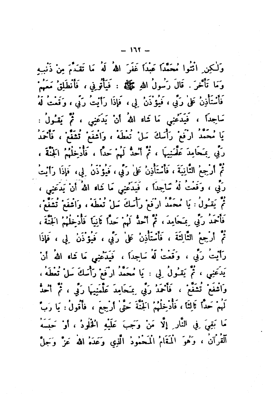 فَأَحْمَدُ رَبِّي بِمَحَامِدَ عَلَّمَنِيهَا، ثُمَّ أَحُدُّ لَهُمْ حَدًّا، فَأُدْخِلُهُمُ الْجَنَّةَ، ثُمَّ أَرْجِعُ الثَّانِيَةَ، فَأَسْتَأْذِنُ عَلَى رَبِّي، فَيُؤْذَنُ لِي، فَإِذَا رَأَيْتُ رَبِّي، وَقَعْتُ لَهُ سَاجِدًا، فَيَدَعُنِي مَا شَاءَ اللَّهُ أَنْ يَدَعَنِي، ثُمَّ يَقُولُ: يَا مُحَمَّدُ، ارْفَعْ رَأْسَكَ، سَلْ تُعْطَهْ، وَاشْفَعْ تُشَفَّعْ.