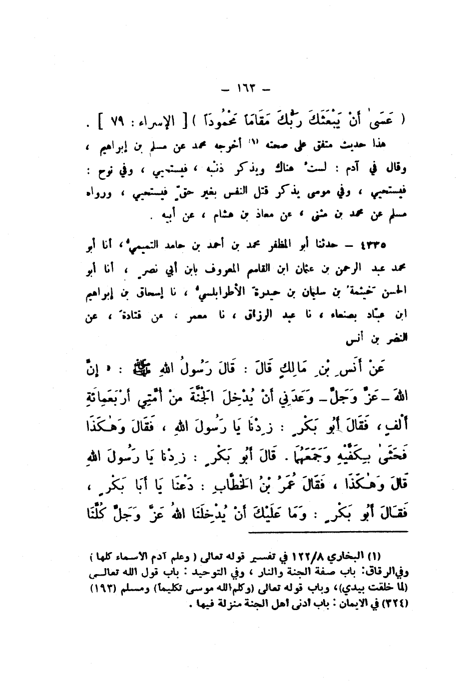 هَذَا حَدِيثٌ مُتَّفَقٌ عَلَى صِحَّتِهِ، أَخْرَجَهُ مُحَمَّدٌ، عَنْ مُسْلِم بْن إِبْرَاهِيمَ، وَقَالَ فِي آدَم: لَسْتُ هُنَاكَ وَيَذْكُرُ ذَنْبَهُ، فَيَسْتَحْيِي، وَفِي نُوحٍ: فَيَسْتَحْيِي، وَفِي مُوسَى: يَذْكُرُ قَتْلَ النَّفْسِ بِغَيْرِ حَقٍّ، فَيَسْتَحْيِي.