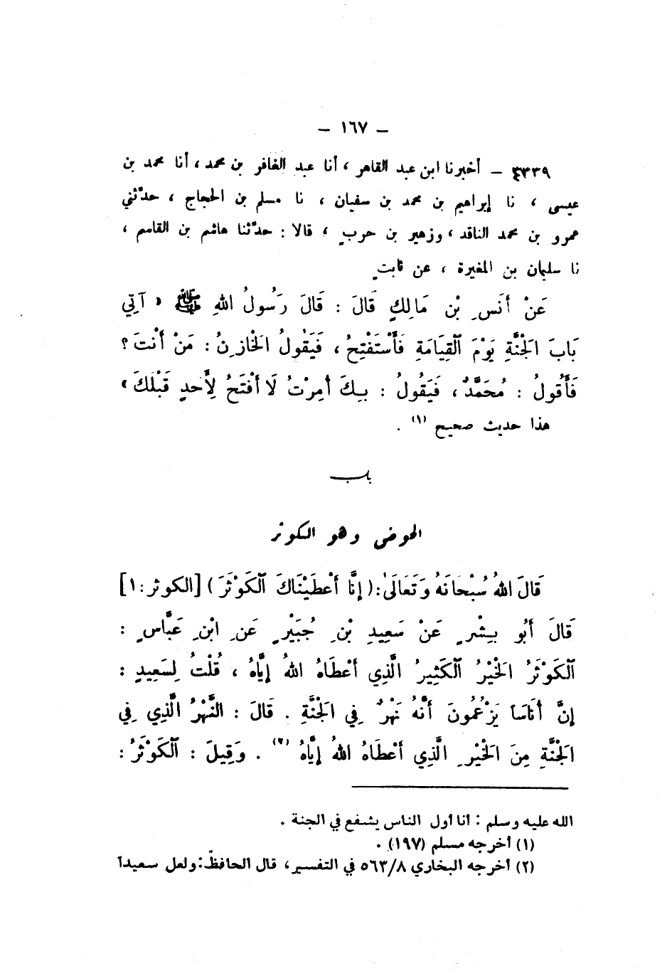 4339 - أَخْبَرَنَا ابْنُ عَبْدِ الْقَاهِرِ، أَنَا عَبْدُ الْغَافِرِ بْنُ مُحَمَّدٍ، أَنَا مُحَمَّدُ بْنُ عِيسَى، نَا إِبْرَاهِيمُ بْنُ مُحَمَّدِ بْنِ سُفْيَانَ، نَا مُسْلِمُ بْنُ الْحَجَّاجِ، حَدَّثَنِي عَمْرُو بْنُ مُحَمَّدٍ النَّاقِدُ، وَزُهَيْرُ بْنُ حَرْبٍ، قَالا: حَدَّثَنَا هَاشِمُ بْنُ الْقَاسِمِ، نَا سُلَيْمَانُ بْنُ الْمُغِيرَةِ، عَنْ ثَابِتٍ، عَنْ أَنَسِ بْنِ مَالِكٍ، قَالَ: قَالَ رَسُولُ اللَّهِ صَلَّى اللهُ عَلَيْهِ وَسَلَّمَ: " آتِي بَابَ الْجَنَّةِ يَوْمَ الْقِيَامَةِ فَأَسْتَفْتِحُ، فَيَقُولُ الْخَازِنُ: مَنْ أَنْتَ؟ فَأَقُولُ: مُحَمَّدٌ، فَيَقُولُ: بِكَ أُمِرْتُ لَا أَفْتَحُ لأَحَدٍ قَبْلَكَ ".