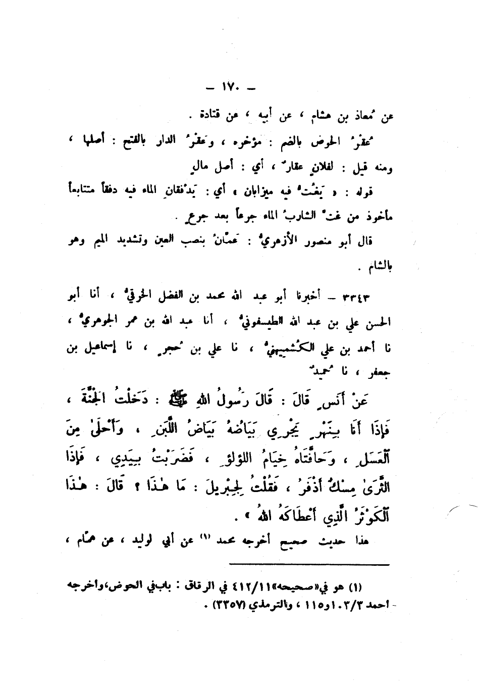 3343 - أَخْبَرَنَا أَبُو عَبْدِ اللَّهِ مُحَمَّدُ بْنُ الْفَضْلِ الْخِرَقِيُّ، أَنَا أَبُو الْحَسَنِ عَلِيُّ بْنُ عَبْدِ اللَّهِ الطَّيْسَفُونِيُّ، أَنَا عَبْدُ اللَّهِ بْنُ عُمَرَ الْجَوْهَرِيُّ، نَا أَحْمَدُ بْنُ عَلِي الْكُشْمِيهَنِيُّ، نَا عَلِيُّ بْنُ حُجْرٍ، نَا إِسْمَاعِيلُ بْنُ جَعْفَرٍ، نَا حُمَيْدٌ، عَنْ أَنَسٍ، قَالَ: قَالَ رَسُولُ اللَّهِ صَلَّى اللهُ عَلَيْهِ وَسَلَّمَ: " دَخَلْتُ الْجَنَّةَ، فَإِذَا أَنَا بِنَهَرٍ يَجْرِي بَيَاضُهُ بَيَاضُ اللَّبَنِ، وَأَحْلَى مِنَ الْعَسَلِ، وَحَافَّتَاهُ خِيَامُ اللُّؤْلُؤِ، فَضَرَبْتُ بِيَدِي، فَإِذَا الثَّرَى مِسْكٌ أَذْفَرُ، فَقُلْتُ لِجِبْرِيلَ: مَا هَذَا؟ قَالَ: هَذَا الْكَوْثَرُ الَّذِي أَعْطَاكَهُ اللَّهُ ".