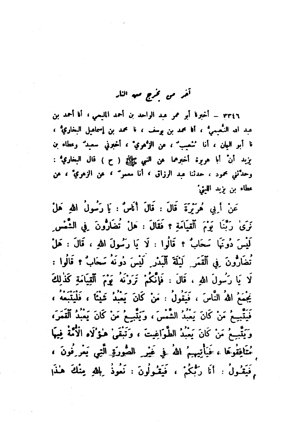 ح، قَالَ الْبُخَارِيُّ: وَحَدَّثَنِي مَحْمُودٌ، حَدَّثَنَا عَبْدُ الرَّزَّاقِ، أَنَا مَعْمَرٌ، عَنِ الزُّهْرِيِّ، عَنْ عَطَاءِ بْنِ يَزِيدَ اللَّيْثِيِّ، عَنْ أَبِي هُرَيْرَةَ، قَالَ: قَالَ أُنَاسٌ: يَا رَسُولَ اللَّهِ، هَلْ نَرَى رَبَّنَا يَوْمَ الْقِيَامَةِ؟ فَقَالَ: «هَلْ تُضَارُّونَ فِي الشَّمْسِ لَيْسَ دُونَهَا سَحَابٌ؟» قَالُوا: لَا يَا رَسُولَ اللَّهِ، قَالَ: «هَلْ تُضَارُّونَ فِي الْقَمَرِ لَيْلَةَ الْبَدْرِ لَيْسَ دُونَهُ سَحَابٌ؟» قَالُوا: لَا يَا رَسُولَ اللَّهِ، قَالَ: " فَإِنَّكُمْ تَرَوْنَهُ يَوْمَ الْقِيَامَةِ كَذَلِكَ، يَجْمَعُ اللَّه النَّاسَ، فَيَقُولُ: مَنْ كَانَ يَعْبُدُ شَيْئًا فَلْيَتْبَعْهُ، فَيَتَّبِعُ مَنْ كَانَ يَعْبُدُ الشَّمْسَ، وَيَتَّبِعُ مَنْ كَانَ يَعْبُدُ الْقَمَرَ، وَيَتَّبِعُ مَنْ كَانَ يَعْبُدُ الطَّوَاغِيتَ، وَتَبْقَى هَؤُلاءِ الأُمَّةُ فِيهَا مُنَافِقُوهَا، فَيَأْتِيهِمُ اللَّهُ فِي غَيْرِ الصُّورَةِ الَّتِي يَعْرِفُونَ، فَيَقُولُ: أَنَا رَبُّكُمْ، فَيَقُولُونَ: نَعُوذُ بِاللَّهِ مِنْكَ، هَذَا