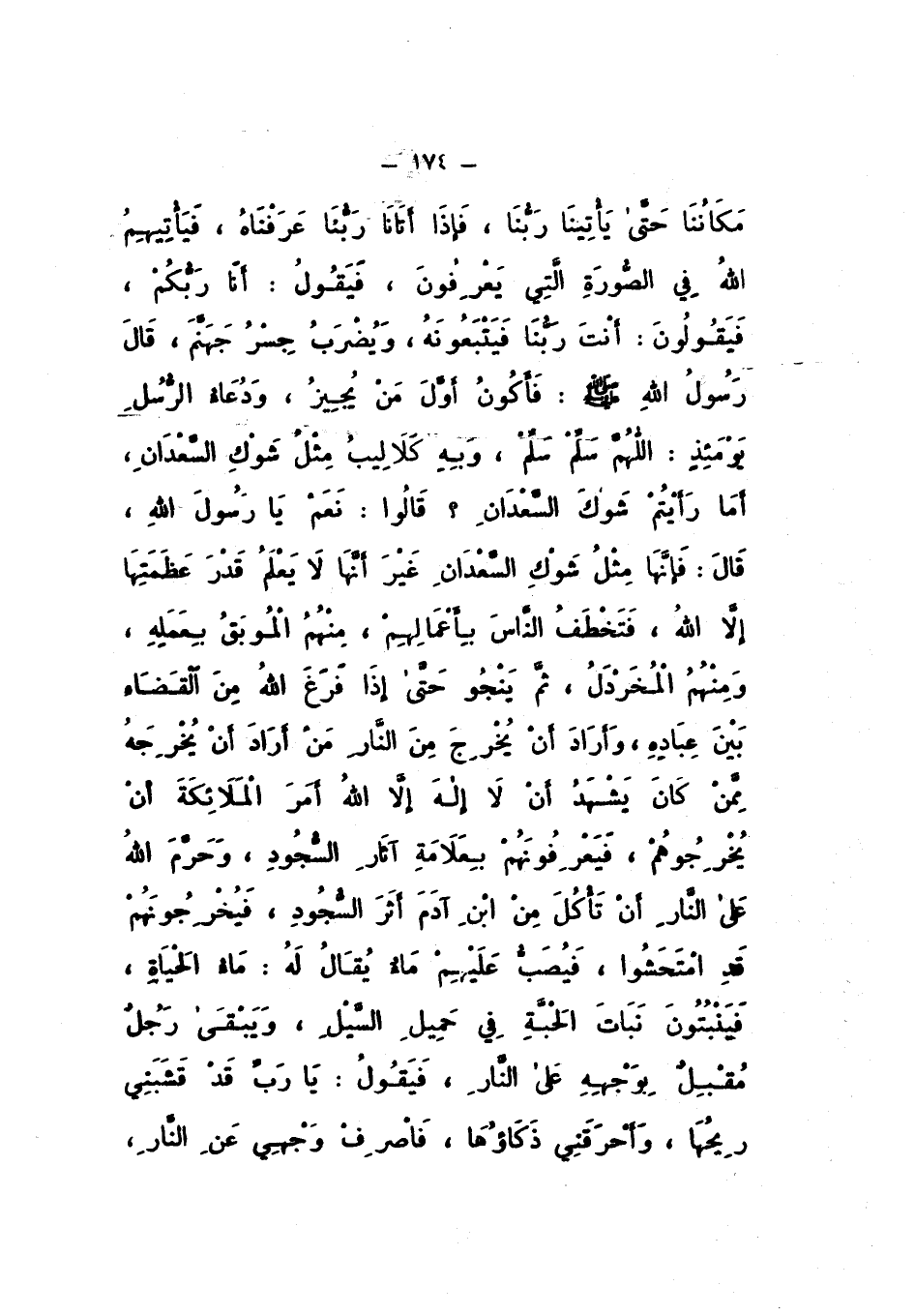 قَالَ: " فَإِنَّهَا مِثْلُ شَوْكِ السَّعْدَانِ غَيْرَ أَنَّهَا لَا يَعْلَمُ قَدْرُ عَظَمَتِهَا إِلا اللَّهُ، فَتَخْطَفُ النَّاسَ بِأَعْمَالِهِمْ، مِنْهُمُ الْمُوبَقُ بِعَمَلِهِ، وَمِنْهُمُ الْمُخَرْدَلُ، ثُمَّ يَنْجُو، حَتَّى إِذَا فَرَغَ اللَّهُ مِنَ الْقَضَاءِ بَيْنَ عِبَادِهِ، وَأَرَادَ أَنْ يُخْرِجَ مِنَ النَّارِ مَنْ أَرَادَ أَنْ يُخْرِجَهُ مِمَّنْ كَانَ يَشْهَدُ أَنْ لَا إِلَهَ إِلا اللَّهُ، أَمَرَ الْمَلائِكَةَ أَنْ يُخْرِجُوهُمْ، فَيَعْرِفُونَهُمْ بِعَلامَةِ آثَارِ السُّجُودِ، وَحَرَّمَ اللَّهُ عَلَى النَّارِ أَنْ تَأْكُلَ مِنَ ابْنِ آدَمَ أَثَرَ السُّجُودِ، فَيُخْرِجُونَهُمْ قَدِ امْتَحَشُوا، فَيُصَبُّ عَلَيْهِمْ مَاءٌ، يُقَالُ لَهُ: مَاءُ الْحَيَاةِ، فَيَنْبُتُونَ نَبَاتَ الْحَبَّةِ فِي حَمِيلِ السَّيْلِ، وَيَبْقَى رَجُلٌ مُقْبِلٌ بِوَجْهِهِ عَلَى النَّارِ، فَيَقُولُ: يَا رَبِّ، قَدْ قَشَبَنِي رِيحُهَا، وَأَحْرَقَنِي ذَكَاؤُهَا، فَاصْرِفْ وَجْهِي عَنِ النَّارِ.