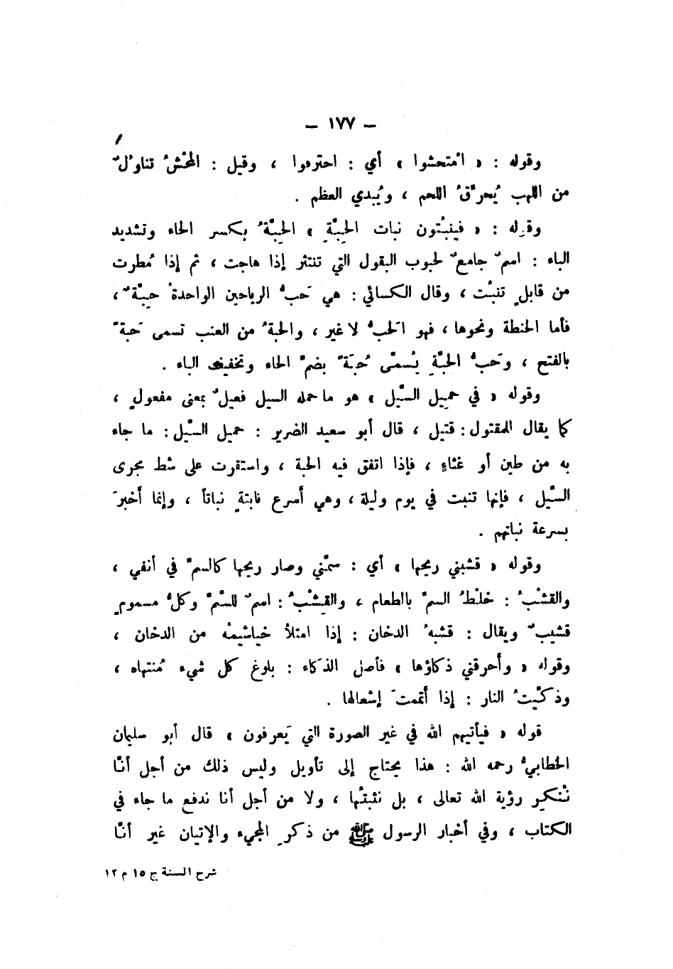 وَقَوله: «فينبتون نَبَات الْحبَّة»، الْحبَّة بِكَسْر الْحَاء وَتَشْديد الْبَاء: اسْم جَامع لحبوب الْبُقُول الَّتِي تنتثر إِذَا هَاجَتْ، ثُمَّ إِذَا مطرَت من قَابل تنْبت، وَقَالَ الْكِسَائِيّ: هِيَ حب الرياحين الْوَاحِدَة حَبَّة، فَأَما الْحِنْطَة وَنَحْوهَا، فَهُوَ الْحبّ لَا غَيْر، والحبة من الْعِنَب تسمى حَبَّة بِالْفَتْح، وَحب الْحبَّة يُسمى حَبَّة بِضَم الْحَاء وَتَخْفِيف الْبَاء.