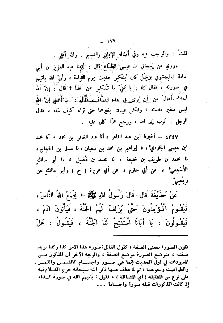 وَرُوِيَ عَنْ إِسْحَاقَ بْنِ عِيسَى الطباع، قَالَ: أَتَيْنَا عَبْدُ الْعَزِيزِ بْن أَبِي سَلَمَةَ الماجشوني بِرَجُل كَانَ يُنكر حَدِيث يَوْم الْقِيَامَةِ، وَأَن اللَّه يَأْتِيهم فِي صورته، فَقَالَ لَهُ: يَا بَنِي، مَا تنكر من هَذَا؟ قَالَ: إِنَّ اللَّهَ أجل وَأَعْظَم من أَن يرى فِي هَذِهِ الصّفة.