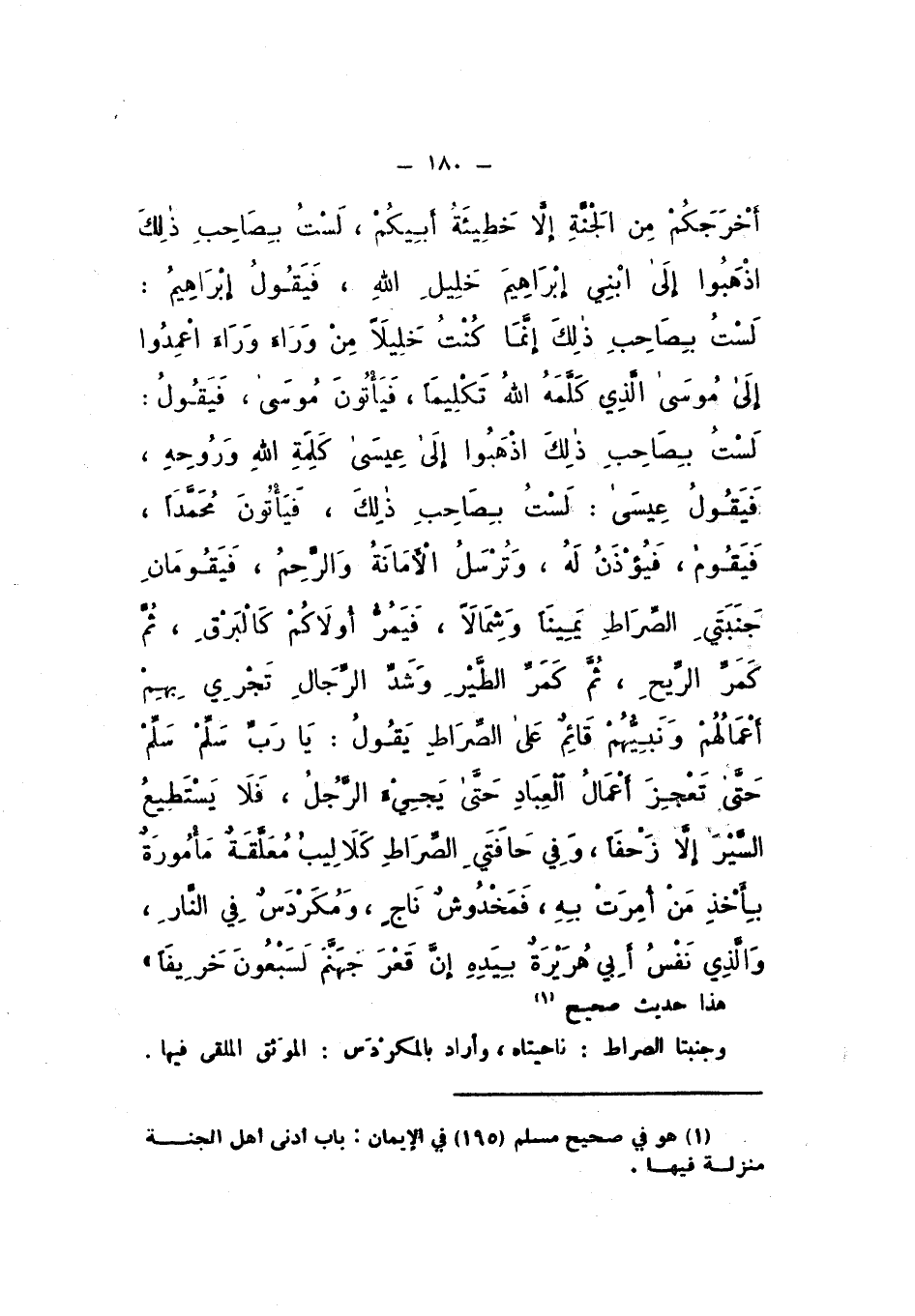 فَيَأْتُونَ مُحَمَّدًا، فَيَقُومُ، فَيُؤْذَنُ لَهُ، وَتُرْسَلُ الأَمَانَةُ وَالرَّحِمُ، فَيَقُومَانِ جَنَبَتَيِ الصِّرَاطِ يَمِينًا وَشِمَالا، فَيَمُرُّ أُولاكُمْ كَالْبَرْقِ، ثُمَّ كَمَرِّ الرِّيحِ، ثُمَّ كَمَرِّ الطَّيْرِ وَشَدُّ الرِّجَالِ، تَجْرِي بِهِمْ أَعْمَالُهُمْ، وَنَبِيُّهُمْ قَائِمٌ عَلَى الصِّرَاطِ، يَقُولُ: يَا رَبِّ، سَلِّمْ سَلِّمْ، حَتَّى تَعْجَزَ أَعْمَالُ الْعِبَادِ حَتَّى يَجِيءَ الرَّجُلُ، فَلا يَسْتَطِيعُ السَّيْرَ إِلا زَحْفًا، وَفِي حَافَتَيِ الصِّرَاطِ كَلالِيبُ مُعَلَّقَةٌ مَأْمُورَةٌ بِأَخْذِ مَنْ أُمِرَتْ بِهِ، فَمَخْدُوشٌ نَاجٍ، وَمُكَرْدَسٌ فِي النَّارِ، وَالَّذِي نَفْسُ أَبِي هُرَيْرَةَ بِيَدِهِ، إِنَّ قَعْرَ جَهَنَّمَ لَسَبْعُونَ خَرِيفًا «.