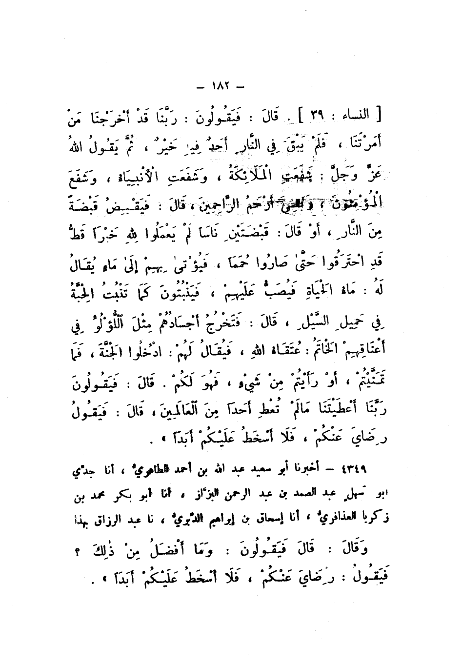 أَخْبَرَنَا أَبُو سَعِيدٍ عَبْدُ اللَّهِ بْنُ أَحْمَدَ الطَّاهِرِيُّ، أَنَا جَدِّي أَبُو سَهْلٍ عَبْدُ الصَّمَدِ بْنُ عَبْدِ الرَّحْمَنِ الْبَزَّازُ، أَنَا أَبُو بَكْرٍ مُحَمَّدُ بْنُ زَكَرِيَّا الْعُذَافِرِيُّ، أَنَا إِسْحَاقُ بْنُ إِبْرَاهِيمَ الدَّبَرِيُّ، نَا عَبْدُ الرَّزَّاقِ بِهَذَا , وَقَالَ: قَالَ: " فَيَقُولُونَ: وَمَا أَفْضَلُ مِنْ ذَلِكَ؟ فَيَقُولُ: رِضَايَ عَنْكُمْ، فَلا أَسْخَطُ عَلَيْكُمْ أَبَدًا ".