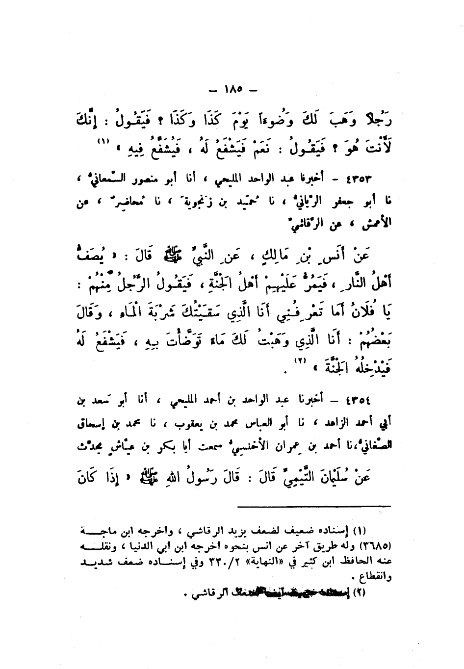 4353 - أَخْبَرَنَا عَبْدُ الْوَاحِدِ الْمَلِيحِيُّ، أَنَا أَبُو مَنْصُورٍ السَّمْعَانِيُّ، نَا أَبُو جَعْفَرٍ الرَّيَّانِيُّ، نَا حُمَيْدُ بْنُ زَنْجُوَيْهِ، نَا مُحَاضِرٌ، عَنِ الأَعْمَشِ، عَنِ الرَّقَاشِيِّ، عَنْ أَنَسِ بْنِ مَالِكٍ، عَنِ النَّبِيِّ صَلَّى اللهُ عَلَيْهِ وَسَلَّمَ، قَالَ: " يُصَفُّ أَهْلُ النَّارِ، فَيَمُرُّ عَلَيْهِمْ أَهْلُ الْجَنَّةِ، فَيَقُولُ الرَّجُلُ مِنْهُمْ: يَا فُلانُ، أَمَا تَعْرِفُنِي؟ أَنَا الَّذِي سَقَيْتُكَ شَرْبَةَ الْمَاءِ، وَقَالَ بَعْضُهُمْ: أَنَا الَّذِي وَهَبْتُ لَكَ مَاءً تَوَضَّأْتَ بِهِ، فَيَشْفَعُ لَهُ، فَيُدْخِلُهُ الْجَنَّةَ "