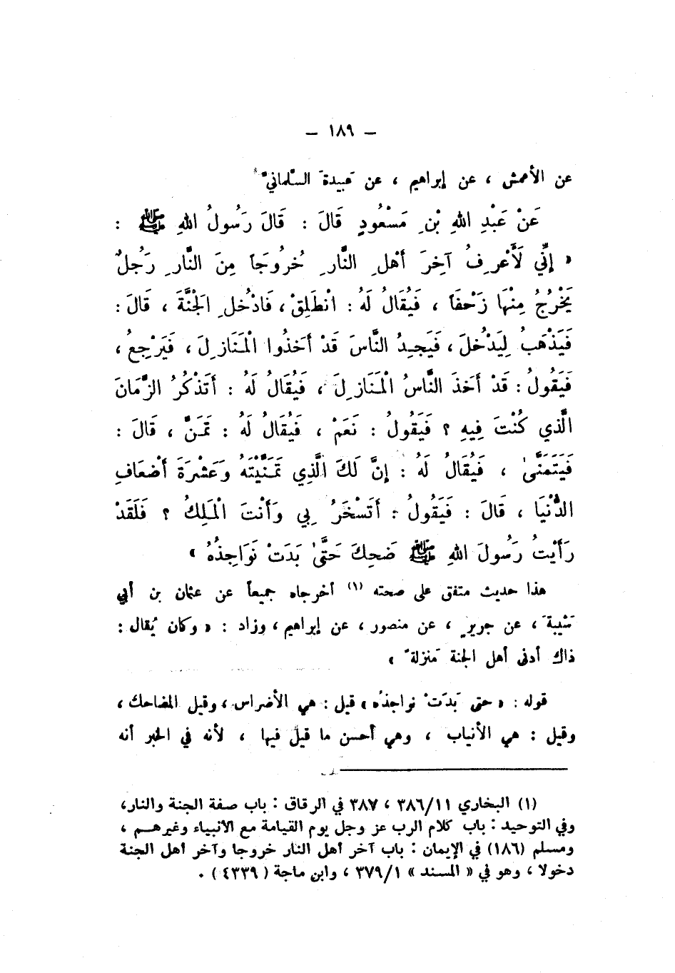 عَنِ الأَعْمَشِ، عَنْ إِبْرَاهِيمَ، عَنْ عُبَيْدَةَ السَّلْمَانِيِّ، عَنْ عَبْدِ اللَّهِ بْنِ مَسْعُودٍ، قَالَ: قَالَ رَسُولُ اللَّهِ صَلَّى اللهُ عَلَيْهِ وَسَلَّمَ: " إِنِّي لأَعْرِفُ آخِرَ أَهْلِ النَّارِ خُرُوجًا مِنَ النَّارِ، رَجُلٌ يَخْرُجُ مِنْهَا زَحْفًا، فَيُقَالُ لَهُ: انْطَلِقْ، فَادْخُلِ الْجَنَّةَ، قَالَ: فَيَذْهَبُ لِيَدْخُلَ، فَيَجِدُ النَّاسَ قَدْ أَخَذُوا الْمَنَازِلَ، فَيَرْجِعُ، فَيَقُولُ: قَدْ أَخَذَ النَّاسُ الْمَنَازِلَ، فَيُقَالُ لَهُ: أَتَذْكُرُ الزَّمَانَ الَّذِي كُنْتَ فِيهِ؟ فَيَقُولُ: نَعَمْ، فَيُقَالُ لَهُ: تَمَنَّ، قَالَ: فَيَتَمَنَّى، فَيُقَالُ لَهُ: إِنَّ لَكَ الَّذِي تَمَنَّيْتَهُ، وَعَشْرَةُ أَضْعَافِ الدُّنْيَا، قَالَ: فَيَقُولُ: أَتَسْخَرُ بِي وَأَنْتَ الْمَلِكُ؟ " فَلَقَدْ رَأَيْتُ رَسُولَ اللَّهِ صَلَّى اللهُ عَلَيْهِ وَسَلَّمَ ضَحِكَ حَتَّى بَدَتْ نَوَاجِذُهُ.